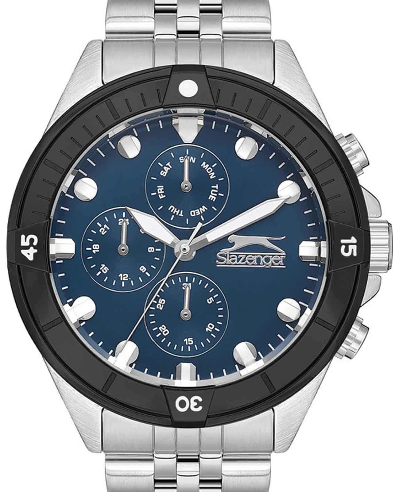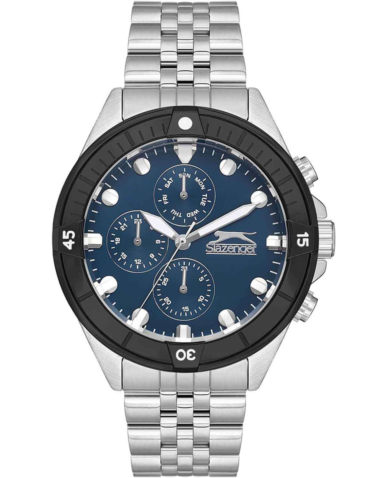Часы Slazenger SL.09.2227.2.05 — это стильная и функциональная модель, созданная для современных мужчин, ценящих качество и надежность. Корпус из прочного металла и безельБезельВнешний ободок, закрепляющий стекло. В спортивных часах так называется поворотное кольцо с делениями на циферблате, выполняет роль таймера – замеряет отрезки времени на шкале. Неподвижный безель – элемент декора. Однонаправленно вращающийся безель на дайверских часах позволяет фиксировать моменты погружения и выныривания на поверхность., который с черным IP-покрытиемIP-покрытиеМетод ионного напыления. Демонстрирует повышенную устойчивость к истиранию, окислению и химическим веществам. Под воздействием высокого давления и температуры около 1500°C молекулы металла надёжно соединяются с частицами корпуса часов., диаметром 46 мм и толщиной 12 мм придаёт часам солидный вид, а серебряный металлический браслет с раскладной застёжкойРаскладная застёжкаТакой тип застёжки используется только на браслетах из металла. Она никогда не раскрывается полностью, происходит разделение на 2 и более частей. Раскладывающая застёжка снизит вероятность потери часов к минимуму. обеспечивает удобство при ношении. Надежный кварцевый механизм гарантирует точность хода, а минеральное стеклоМинеральное стеклоМинеральное стекло представляет собой искусственно выращенный минерал кварца. Такое стекло отличается особой устойчивостью к повреждениям и царапинам. Уступает по некоторым качествам сапфировому стеклу. защищает синий циферблат от царапин. Модель оснащена дополнительными малыми циферблатами, отображающими дату, день недели и текущее время в 24-часовом формате, что делает часы особенно практичными. Для удобства использования в темное время суток предусмотрено люминесцентное покрытиеЛюминесцентное покрытиеПозволяет считывать показания времени в темноте. Производители наносят на стрелки, часовые индексы, безель или поверхность циферблата светонакопительный состав, дающий холодное свечение. стрелок. Заводная головка имеет специальную защиту. Водозащита уровня WR 50 позволяет не беспокоиться о случайном попадании воды. Вес изделия составляет 161 грамм. Эти часы станут отличным выбором для тех, кто ценит элегантность и функциональность в одном аксессуаре.
