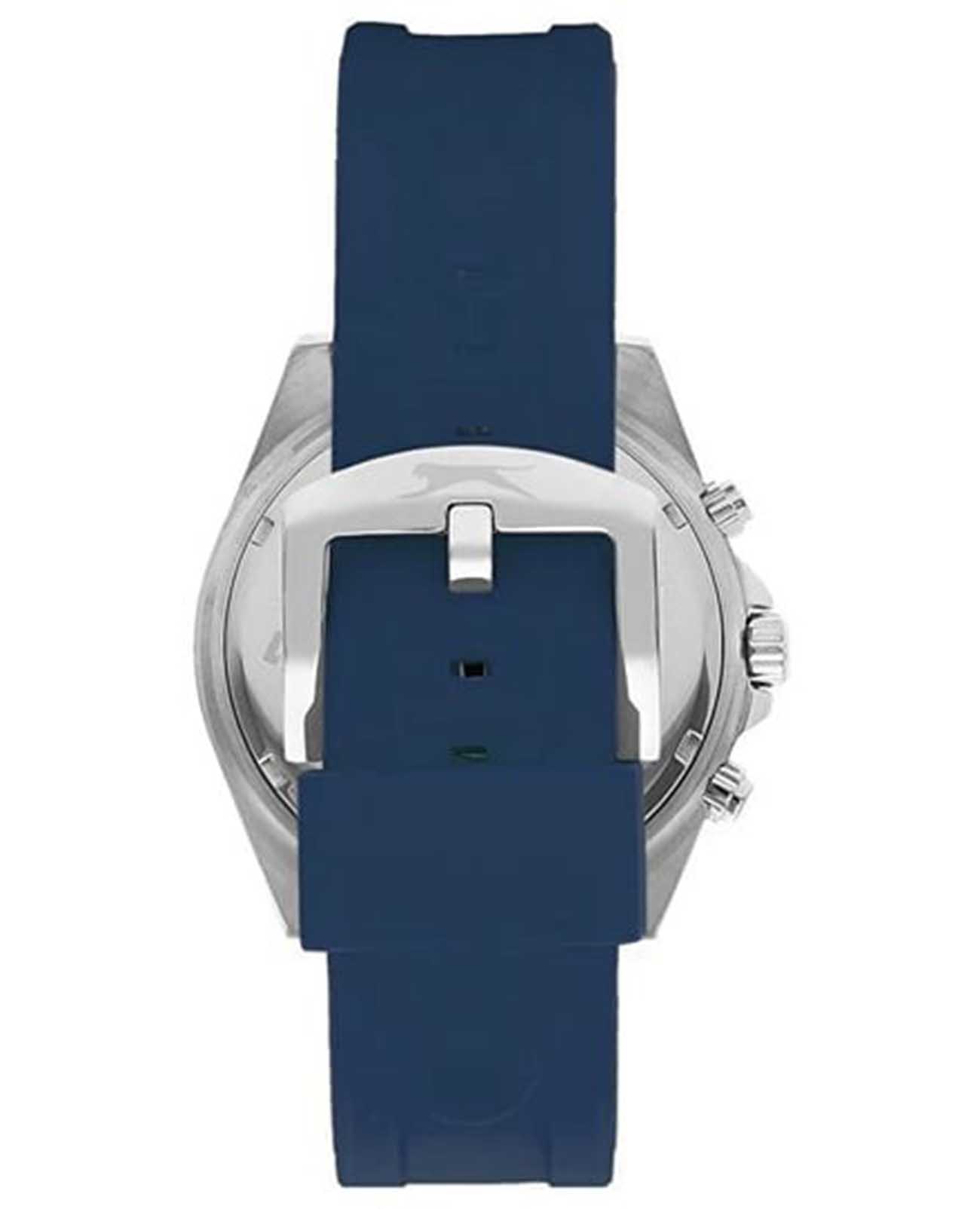 Часы Slazenger SL.09.2274.2.02 сочетают в себе современный стиль и надежность. Круглый корпус диаметром 44 мм выполнен из суперметалла, что придает модели выразительный и элегантный вид. Синий циферблат с логотипом бренда защищен прочным минеральным стекломМинеральное стеклоМинеральное стекло представляет собой искусственно выращенный минерал кварца. Такое стекло отличается особой устойчивостью к повреждениям и царапинам. Уступает по некоторым качествам сапфировому стеклу., рифленый сатинированный безельБезельВнешний ободок, закрепляющий стекло. В спортивных часах так называется поворотное кольцо с делениями на циферблате, выполняет роль таймера – замеряет отрезки времени на шкале. Неподвижный безель – элемент декора. Однонаправленно вращающийся безель на дайверских часах позволяет фиксировать моменты погружения и выныривания на поверхность. с синим IP-покрытиемIP-покрытиеМетод ионного напыления. Демонстрирует повышенную устойчивость к истиранию, окислению и химическим веществам. Под воздействием высокого давления и температуры около 1500°C молекулы металла надёжно соединяются с частицами корпуса часов. украшен минутными отметками. На дополнительных циферблатах отображаются дата, день недели и время в 12- и 24-часовом формате. Надежный кварцевый механизм обеспечивает точность хода. Силиконовый синий ремешок шириной 22 мм удобно фиксируется на запястье с помощью классической застежки. Стрелки и метки с люминесцентным покрытиемЛюминесцентное покрытиеПозволяет считывать показания времени в темноте. Производители наносят на стрелки, часовые индексы, безель или поверхность циферблата светонакопительный состав, дающий холодное свечение. удобно подсвечиваются в темноте после зарядки на свету. Водозащита 50WR позволяет использовать часы в повседневной жизни, а вес 90 г и толщина корпуса 12 мм делают их комфортными для ежедневного ношения.
