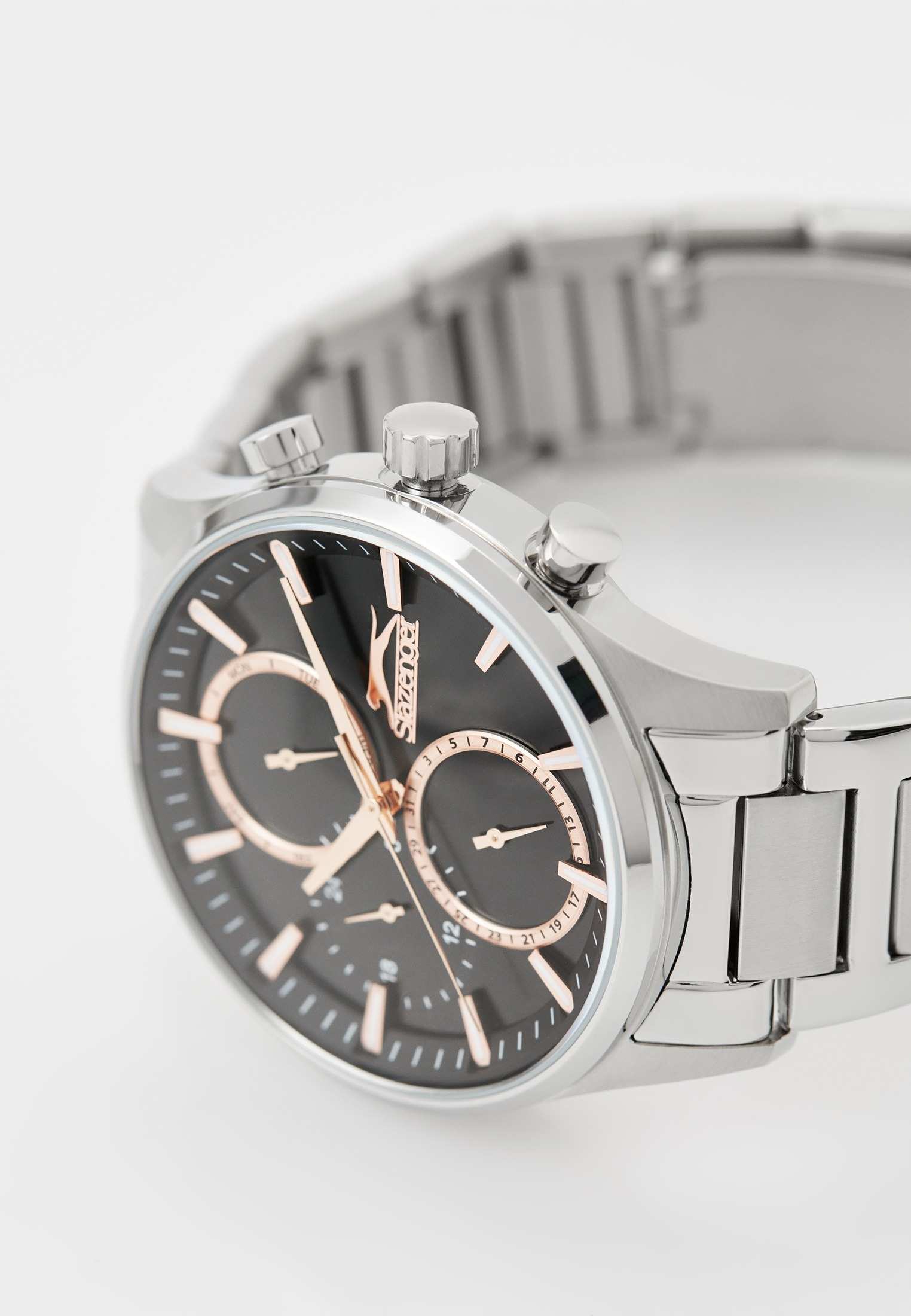 Часы Slazenger SL.09.2283.2.02 — это стильный и надежный аксессуар, который подчеркивает индивидуальность своего владельца. Корпус и браслет выполнены из прочного суперметалла — инновационного сплава на основе меди с пониженным содержанием цинка и никеля, дополненного специальным покрытием для долговечности и эстетики. Черный циферблат надежно защищен минеральным стекломМинеральное стеклоМинеральное стекло представляет собой искусственно выращенный минерал кварца. Такое стекло отличается особой устойчивостью к повреждениям и царапинам. Уступает по некоторым качествам сапфировому стеклу., устойчивым к царапинам и механическим повреждениям. Модель оснащена кварцевым механизмом, что гарантирует высокую точность хода. На отдельные циферблаты вынесены указатели 24-часового времени, даты и дня недели, что делает использование часов особенно удобным в повседневной жизни. Стальной браслет с раскладной застёжкойРаскладная застёжкаТакой тип застёжки используется только на браслетах из металла. Она никогда не раскрывается полностью, происходит разделение на 2 и более частей. Раскладывающая застёжка снизит вероятность потери часов к минимуму. обеспечивает комфортную посадку. Водозащита 5 АТМ позволяет не беспокоиться о случайных брызгах или дожде. Метки с люминесцентным покрытиемЛюминесцентное покрытиеПозволяет считывать показания времени в темноте. Производители наносят на стрелки, часовые индексы, безель или поверхность циферблата светонакопительный состав, дающий холодное свечение. удобно подсвечиваются в темноте после зарядки на свету. Диаметр корпуса составляет 43 мм, толщина — 13 мм, что обеспечивает комфортное ношение на запястье. Часы станут отличным выбором для повседневного использования или дополнения к деловому образу, а также послужат отличным подарком на любой праздник.