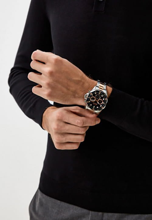 Мужские кварцевые часы Slazenger SL.09.2309.2.04 — это выразительный и функциональный аксессуар, сочетающий прочность, стиль и насыщенную комплектацию. Браслет выполнен из суперметалла с IP-покрытиемIP-покрытиеМетод ионного напыления. Демонстрирует повышенную устойчивость к истиранию, окислению и химическим веществам. Под воздействием высокого давления и температуры около 1500°C молекулы металла надёжно соединяются с частицами корпуса часов., защищён минеральным стекломМинеральное стеклоМинеральное стекло представляет собой искусственно выращенный минерал кварца. Такое стекло отличается особой устойчивостью к повреждениям и царапинам. Уступает по некоторым качествам сапфировому стеклу.. Циферблат чёрного цвета оформлен с вынесенными малыми циферблатами для индикации дня недели, даты и времени в 24-часовом формате. Стрелки и метки оснащены люминесцентным покрытиемЛюминесцентное покрытиеПозволяет считывать показания времени в темноте. Производители наносят на стрелки, часовые индексы, безель или поверхность циферблата светонакопительный состав, дающий холодное свечение., обеспечивающим хорошую читаемость в темноте. Заводная головка снабжена защитой, а задняя крышка — завинчивающаяся, что повышает надёжность конструкции. Браслет комбинированного цвета фиксируется на раскладной застёжкеРаскладная застёжкаТакой тип застёжки используется только на браслетах из металла. Она никогда не раскрывается полностью, происходит разделение на 2 и более частей. Раскладывающая застёжка снизит вероятность потери часов к минимуму., обеспечивая удобство и безопасность ношения. Водонепроницаемость 50 м позволяет использовать часы в повседневных условиях, защищая от случайных брызг и капель дождя. Модель подчёркивает индивидуальность владельца и идеально подходит как для повседневного, так и для делового образа.