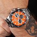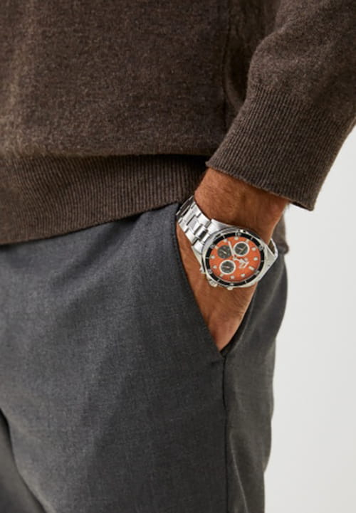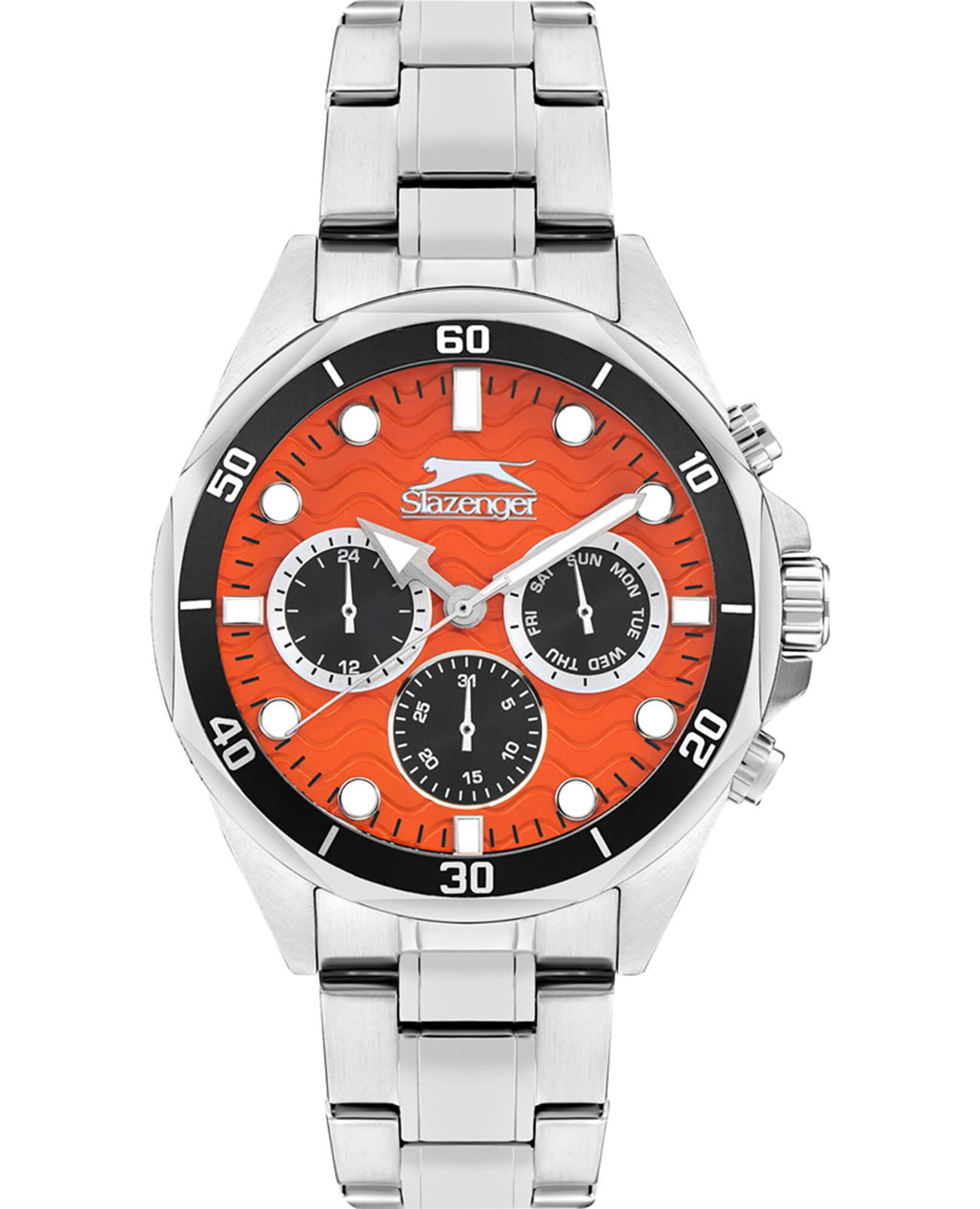 Мужские кварцевые часы Slazenger SL.09.2309.2.05 — это выразительный и функциональный аксессуар, сочетающий прочность, стиль и насыщенную комплектацию. Корпус и браслет выполнены из суперметалла, защищён минеральным стекломМинеральное стеклоМинеральное стекло представляет собой искусственно выращенный минерал кварца. Такое стекло отличается особой устойчивостью к повреждениям и царапинам. Уступает по некоторым качествам сапфировому стеклу.. Циферблат оранжевого цвета оформлен с вынесенными малыми циферблатами для индикации дня недели, даты и времени в 24-часовом формате. Стрелки и метки оснащены люминесцентным покрытиемЛюминесцентное покрытиеПозволяет считывать показания времени в темноте. Производители наносят на стрелки, часовые индексы, безель или поверхность циферблата светонакопительный состав, дающий холодное свечение., обеспечивающим хорошую читаемость в темноте. Заводная головка снабжена защитой, а задняя крышка — завинчивающаяся, что повышает надёжность конструкции. Браслет из суперметалла фиксируется на раскладной застёжкеРаскладная застёжкаТакой тип застёжки используется только на браслетах из металла. Она никогда не раскрывается полностью, происходит разделение на 2 и более частей. Раскладывающая застёжка снизит вероятность потери часов к минимуму., обеспечивая удобство и безопасность ношения. Водонепроницаемость 50 м позволяет использовать часы в повседневных условиях, защищая от случайных брызг и капель дождя. Модель подчёркивает индивидуальность владельца и идеально подходит как для повседневного, так и для делового образа.