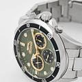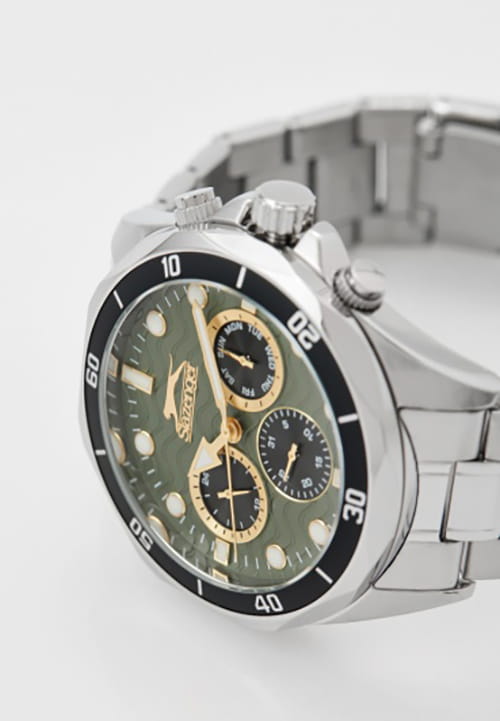 Мужские кварцевые часы Slazenger SL.09.2309.2.06 — это выразительный и функциональный аксессуар, сочетающий прочность, стиль и насыщенную комплектацию. Корпус и браслет выполнены из суперметалла, защищён минеральным стекломМинеральное стеклоМинеральное стекло представляет собой искусственно выращенный минерал кварца. Такое стекло отличается особой устойчивостью к повреждениям и царапинам. Уступает по некоторым качествам сапфировому стеклу.. Циферблат зелёного цвета оформлен с вынесенными малыми циферблатами для индикации дня недели, даты и времени в 24-часовом формате. Стрелки и метки оснащены люминесцентным покрытиемЛюминесцентное покрытиеПозволяет считывать показания времени в темноте. Производители наносят на стрелки, часовые индексы, безель или поверхность циферблата светонакопительный состав, дающий холодное свечение., обеспечивающим хорошую читаемость в темноте. Заводная головка снабжена защитой, а задняя крышка — завинчивающаяся, что повышает надёжность конструкции. Браслет из суперметалла фиксируется на раскладной застёжкеРаскладная застёжкаТакой тип застёжки используется только на браслетах из металла. Она никогда не раскрывается полностью, происходит разделение на 2 и более частей. Раскладывающая застёжка снизит вероятность потери часов к минимуму., обеспечивая удобство и безопасность ношения. Водонепроницаемость 50 м позволяет использовать часы в повседневных условиях, защищая от случайных брызг и капель дождя. Модель подчёркивает индивидуальность владельца и идеально подходит как для повседневного, так и для делового образа.
