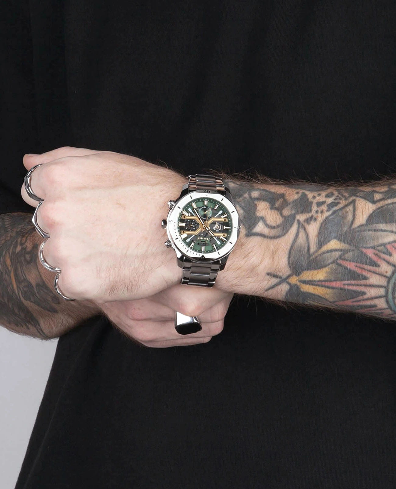 Мужские кварцевые часы Slazenger — это выразительный и функциональный аксессуар. Корпус диаметром 44 мм и толщиной 12 мм выполнен из суперметалла. Циферблат зелёного цвета частично скелетонизирован. Циферблат защищён минеральным стекломМинеральное стеклоМинеральное стекло представляет собой искусственно выращенный минерал кварца. Такое стекло отличается особой устойчивостью к повреждениям и царапинам. Уступает по некоторым качествам сапфировому стеклу.. Механизм — кварцевый калибр VX9JE1. Часы оснащены индикацией дня недели, даты и 12/24-часового формата времени. Часы оснащены браслетом из суперметалла с раскладной застёжкойРаскладная застёжкаТакой тип застёжки используется только на браслетах из металла. Она никогда не раскрывается полностью, происходит разделение на 2 и более частей. Раскладывающая застёжка снизит вероятность потери часов к минимуму.. Водонепроницаемость 50 м позволяет использовать часы в повседневных условиях. Гарантия — 12 месяцев. Идеальный выбор для тех, кто ценит стиль, функциональность и качество.