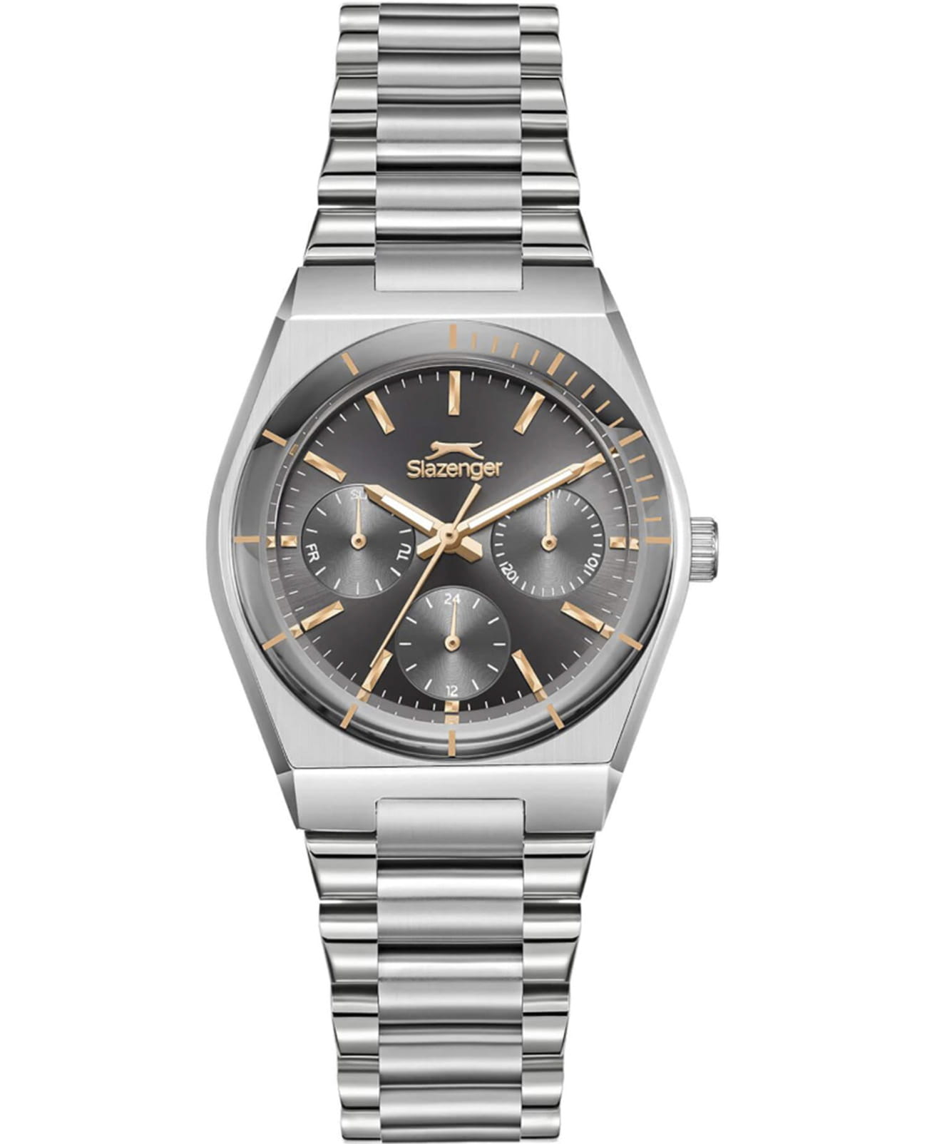 Женские кварцевые часы Slazenger — это элегантный и функциональный аксессуар. Корпус диаметром 33 мм и толщиной 10,5 мм выполнен из суперметалла. БезельБезельВнешний ободок, закрепляющий стекло. В спортивных часах так называется поворотное кольцо с делениями на циферблате, выполняет роль таймера – замеряет отрезки времени на шкале. Неподвижный безель – элемент декора. Однонаправленно вращающийся безель на дайверских часах позволяет фиксировать моменты погружения и выныривания на поверхность. из суперметалла с IP-покрытиемIP-покрытиеМетод ионного напыления. Демонстрирует повышенную устойчивость к истиранию, окислению и химическим веществам. Под воздействием высокого давления и температуры около 1500°C молекулы металла надёжно соединяются с частицами корпуса часов.. Циферблат чёрного цвета оформлен индексами и стрелками и защищён минеральным стекломМинеральное стеклоМинеральное стекло представляет собой искусственно выращенный минерал кварца. Такое стекло отличается особой устойчивостью к повреждениям и царапинам. Уступает по некоторым качествам сапфировому стеклу.. Механизм — кварцевый. Часы оснащены индикацией дня недели, даты и 12/24-часового формата времени. Стрелки с люминесцентным покрытиемЛюминесцентное покрытиеПозволяет считывать показания времени в темноте. Производители наносят на стрелки, часовые индексы, безель или поверхность циферблата светонакопительный состав, дающий холодное свечение., обеспечивающим хорошую читаемость в темноте. Часы оснащены браслетом из суперметалла с раскладной застёжкойРаскладная застёжкаТакой тип застёжки используется только на браслетах из металла. Она никогда не раскрывается полностью, происходит разделение на 2 и более частей. Раскладывающая застёжка снизит вероятность потери часов к минимуму.. Водонепроницаемость 50 м позволяет использовать часы в повседневных условиях. Гарантия — 12 месяцев. Идеальный выбор для тех, кто ценит стиль, функциональность и качество.