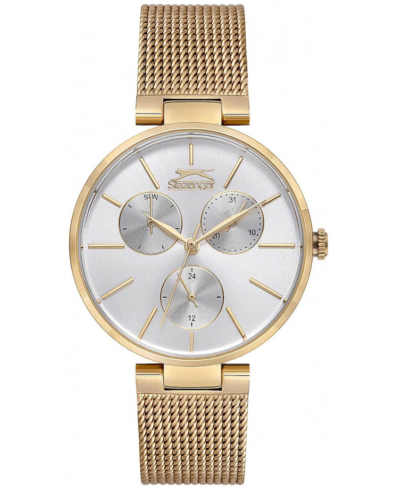 Женские кварцевые часы Slazenger — это выразительный и функциональный аксессуар. Корпус диаметром 34 мм и толщиной 8 мм выполнен из суперметалла с IP-покрытиемIP-покрытиеМетод ионного напыления. Демонстрирует повышенную устойчивость к истиранию, окислению и химическим веществам. Под воздействием высокого давления и температуры около 1500°C молекулы металла надёжно соединяются с частицами корпуса часов.. Циферблат белого цвета оформлен индексами, стрелками и тремя вынесенными субциферблатами: для отображения дня недели, даты и 24-часового формата времени. Циферблат защищён минеральным стекломМинеральное стеклоМинеральное стекло представляет собой искусственно выращенный минерал кварца. Такое стекло отличается особой устойчивостью к повреждениям и царапинам. Уступает по некоторым качествам сапфировому стеклу.. Часы оснащены браслетом миланского плетения из суперметалла на раскладном замкеРаскладная застёжкаТакой тип застёжки используется только на браслетах из металла. Она никогда не раскрывается полностью, происходит разделение на 2 и более частей. Раскладывающая застёжка снизит вероятность потери часов к минимуму.. Водонепроницаемость 30 м позволяет использовать часы в повседневных условиях. Идеальный выбор для тех, кто ценит стиль и качество.