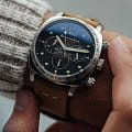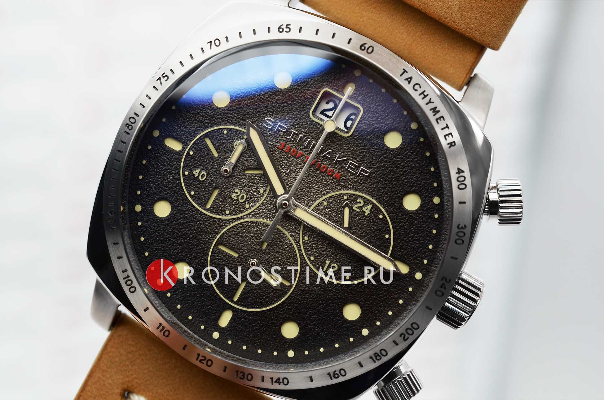 Мужской кварцевый хронографХронографФункция позволяет измерять отрезки времени с особой точностью: часы, минуты, секунды. Верным признаком хронографа является наличие на циферблате 3 дополнительных окошек-счётчиков. с секундомеромСекундомерСекундоме́р — прибор, способный измерять интервалы времени с точностью до долей секунды. и тахиметромТахиметрРазмеченная шкала, располагается на ободке или безеле часов. Тахиметр позволяет рассчитать скорость на определённом участке пути, расстояние измеряется в километрах или милях.. Калибр механизма TMI VK73. Центральные часовая и минутная стрелки, секундная стрелка вынесена на малый циферблат. Большая дата в позиции 12 часов. 12/24х часовой формат времени. Корпус выполнен из нержавеющей стали. Коричневый кожаный ремешок шириной 22 мм, стандартная застежка. Циферблат с люминесцентным покрытиемЛюминесцентное покрытиеПозволяет считывать показания времени в темноте. Производители наносят на стрелки, часовые индексы, безель или поверхность циферблата светонакопительный состав, дающий холодное свечение. стрелок и меток, дополнен выпуклым минеральным стекломМинеральное стеклоМинеральное стекло представляет собой искусственно выращенный минерал кварца. Такое стекло отличается особой устойчивостью к повреждениям и царапинам. Уступает по некоторым качествам сапфировому стеклу. , устойчивым к мелким механическим повреждениям. Водостойкость WR 100 (плавание без погружения).