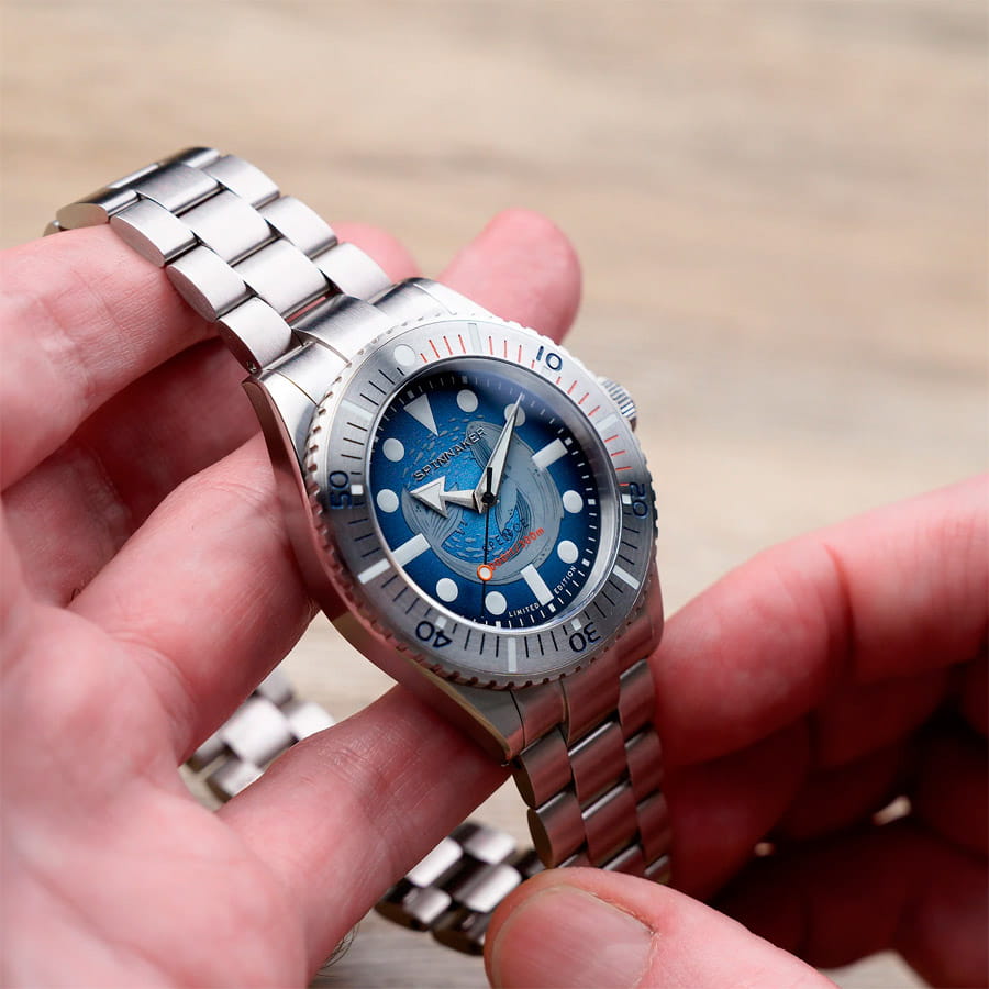 Мужские итальянские часы Spinnaker Spence SP-5124-11 из лимитированной серии (300 экземпляров). Механические часы с автоподзаводом. Циферблат с люминесцентным покрытиемЛюминесцентное покрытиеПозволяет считывать показания времени в темноте. Производители наносят на стрелки, часовые индексы, безель или поверхность циферблата светонакопительный состав, дающий холодное свечение. стрелок, меток и безеля дополнен сапфировым стекломСапфировое стеклоПрочный и надёжный материал из кристалла сапфира синтетического происхождения, характеризующийся особой твёрдостью и устойчивостью к царапинам и повреждениям. с антибликовым покрытиемАнтибликовое покрытиеСлой оксида металла в 0,13-0,3 микрон, благодаря которому стекло часов не бликует и не отражает свет. Антибликовое покрытие уменьшает отражение света в 10 раз, обеспечивая отличную читаемость показателей циферблата., устойчивым к появлению царапин и обладающее высокой прозрачностью. Класс водозащиты: 300 метров, позволит плавать, нырять и заниматься другими водными видами спорта. Корпус часов изготовлен из нержавеющей стали с поворотным безелемБезельВнешний ободок, закрепляющий стекло. В спортивных часах так называется поворотное кольцо с делениями на циферблате, выполняет роль таймера – замеряет отрезки времени на шкале. Неподвижный безель – элемент декора. Однонаправленно вращающийся безель на дайверских часах позволяет фиксировать моменты погружения и выныривания на поверхность. . Браслет выполнен из нержавеющей стали на раскладной застёжкеРаскладная застёжкаТакой тип застёжки используется только на браслетах из металла. Она никогда не раскрывается полностью, происходит разделение на 2 и более частей. Раскладывающая застёжка снизит вероятность потери часов к минимуму.. Ширина браслета 20 мм. В комплекте дополнительный нейлоновый ремешок синего цвета.