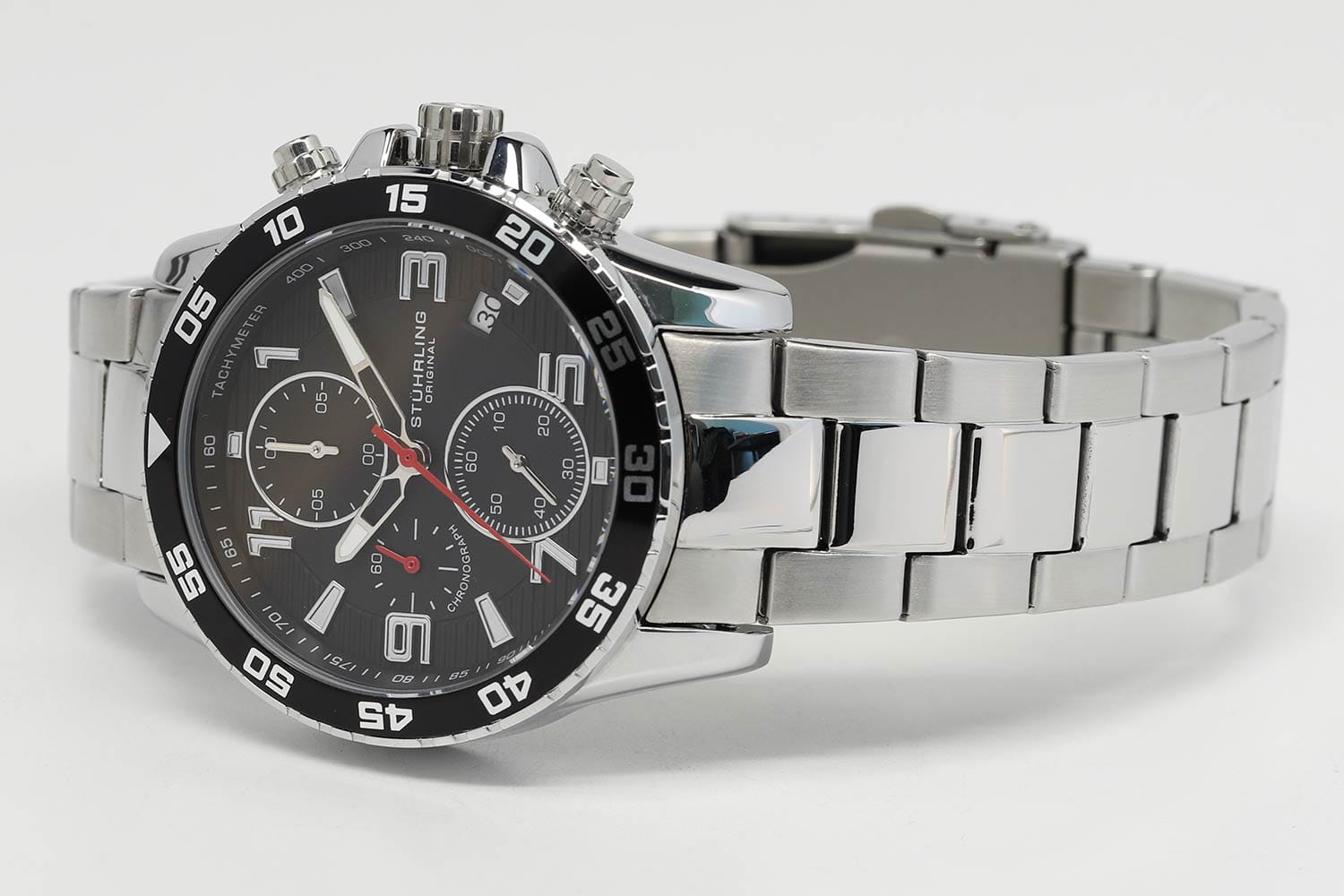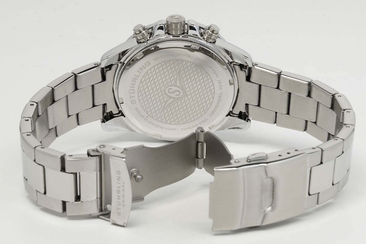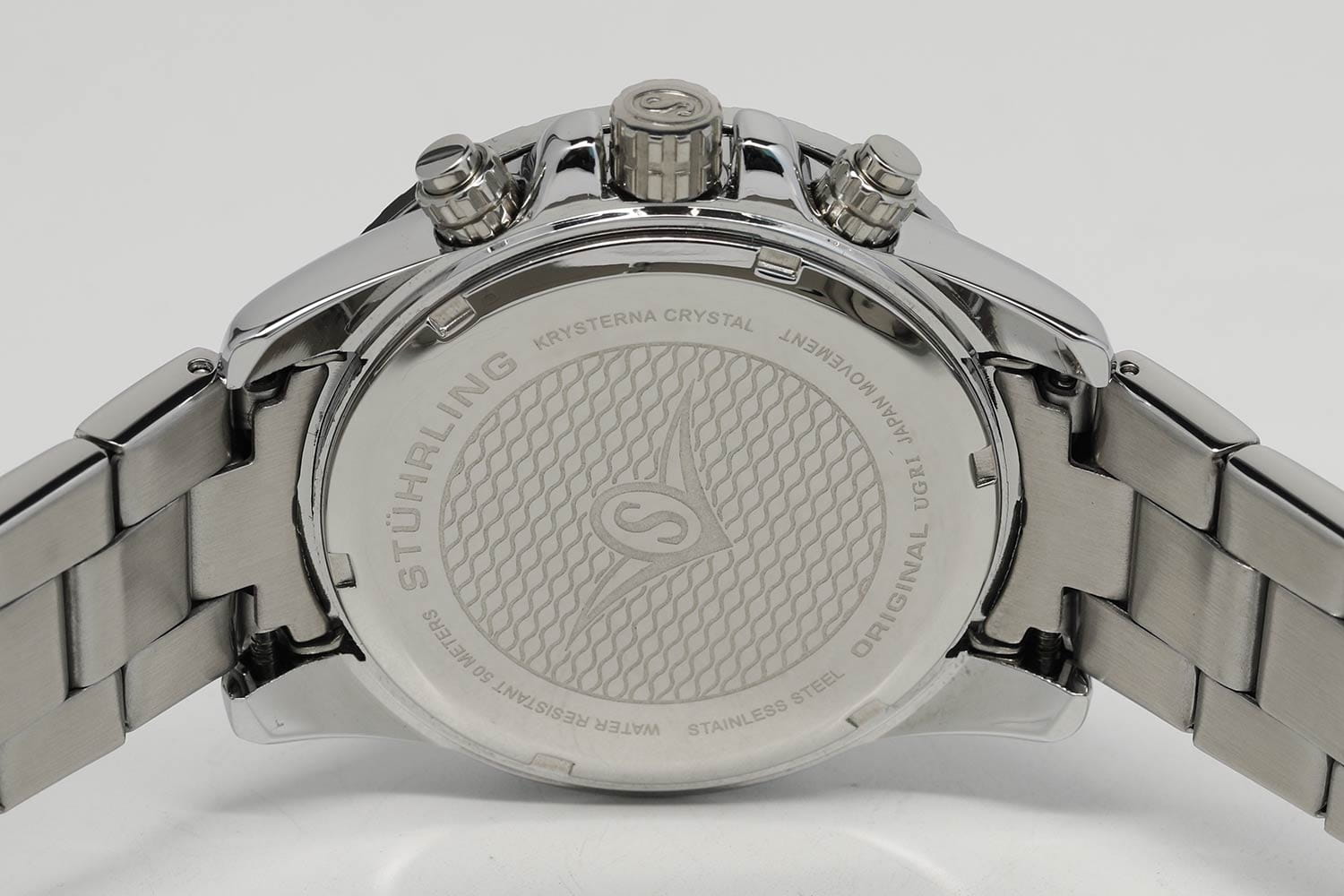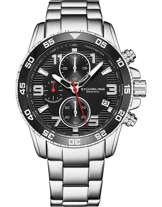 Stuhrling 3957.1 — мощные мужские часы с выразительным спортивным характером и динамичным дизайном. Корпус из нержавеющей стали гармонично сочетается с циферблатом, оформленным рельефным узором и контрастными счётчиками хронографаХронографФункция позволяет измерять отрезки времени с особой точностью: часы, минуты, секунды. Верным признаком хронографа является наличие на циферблате 3 дополнительных окошек-счётчиков.. Широкий безельБезельВнешний ободок, закрепляющий стекло. В спортивных часах так называется поворотное кольцо с делениями на циферблате, выполняет роль таймера – замеряет отрезки времени на шкале. Неподвижный безель – элемент декора. Однонаправленно вращающийся безель на дайверских часах позволяет фиксировать моменты погружения и выныривания на поверхность. с PVD-покрытиемPVDУльтратонкое покрытие наносится в технике вакуумного напыления, сочетает в себе нитрид титана особой прочности со слоем золота или оксида хрома. Несёт в себе декоративную или защитную функцию. подчёркивает брутальный стиль модели, а стрелки и метки с люминесцентным покрытиемЛюминесцентное покрытиеПозволяет считывать показания времени в темноте. Производители наносят на стрелки, часовые индексы, безель или поверхность циферблата светонакопительный состав, дающий холодное свечение. обеспечивают идеальную читаемость в любых условиях. Прочное стекло KrysternaKrysternaKrysterna — инновационное стекло для наручных часов. Благодаря уникальной структуре, Krysterna объединяет ключевые преимущества двух материалов: твердость сапфира, защищающую от царапин, и гибкость минерального стекла, обеспечивающую устойчивость к деформациям. Такая комбинация делает его идеальным решением для часов, подверженных экстремальным нагрузкам, сохраняя при этом оптическую прозрачность. устойчиво к царапинам, сохраняя прозрачность и блеск. Завершает образ стальной браслет с раскладной застёжкойРаскладная застёжкаТакой тип застёжки используется только на браслетах из металла. Она никогда не раскрывается полностью, происходит разделение на 2 и более частей. Раскладывающая застёжка снизит вероятность потери часов к минимуму., гарантирующий комфорт и надёжную фиксацию. Stuhrling — стильная и функциональная модель для уверенных мужчин, ценящих точность и энергию в каждой детали.