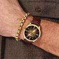 Stuhrling 4014.2 — элегантные мужские часы, объединяющие строгую классику и современную функциональность. Корпус из нержавеющей стали с PVD-покрытиемPVDУльтратонкое покрытие наносится в технике вакуумного напыления, сочетает в себе нитрид титана особой прочности со слоем золота или оксида хрома. Несёт в себе декоративную или защитную функцию. создают ощущение монолитной надёжности, а глубокий циферблат с вертикальной текстурой придаёт модели выразительность и характер. Кожаный ремешок на стандартной застежке обеспечивает комфорт. Крупные метки и стрелки обеспечивают идеальную читаемость. На позиции «3 часов» расположено аккуратное окно даты, подчёркивающее симметрию дизайна. Прочное стекло Krysterna защищает циферблат от царапин, а надёжный кварцевый механизм гарантирует стабильную точность. Stuhrling — выбор уверенного мужчины, ценящего сочетание функциональности, лаконичного дизайна и безупречной отделки.