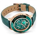 Женские часы Swarovski Octea Lux Chrono 5452498 – это роскошные часы с секундомеромСекундомерСекундоме́р — прибор, способный измерять интервалы времени с точностью до долей секунды. и хронографомХронографФункция позволяет измерять отрезки времени с особой точностью: часы, минуты, секунды. Верным признаком хронографа является наличие на циферблате 3 дополнительных окошек-счётчиков., поистине, образец точности и роскоши, ведь они сочетают в себе лучшие традиции швейцарского часового искусства и неповторимое мастерство Swarovski. Прекрасный аксессуар, подходящий к любому повседневному образу. Часы имеют функцию хронографаХронографФункция позволяет измерять отрезки времени с особой точностью: часы, минуты, секунды. Верным признаком хронографа является наличие на циферблате 3 дополнительных окошек-счётчиков., позволяющую запустить отсчет, остановить его и обнулить результаты. Корпус из нержавеющей стали с PVDPVDУльтратонкое покрытие наносится в технике вакуумного напыления, сочетает в себе нитрид титана особой прочности со слоем золота или оксида хрома. Несёт в себе декоративную или защитную функцию. покрытием оттенка розового золота гармонично сочетается с огранённым кристальным безелемБезельВнешний ободок, закрепляющий стекло. В спортивных часах так называется поворотное кольцо с делениями на циферблате, выполняет роль таймера – замеряет отрезки времени на шкале. Неподвижный безель – элемент декора. Однонаправленно вращающийся безель на дайверских часах позволяет фиксировать моменты погружения и выныривания на поверхность., который встречается только в коллекции часов Swarovski, циферблатом зеленого цвета с рисунком в виде солнечных лучей и ремешком из натуральной кожи с тиснением под крокодила сияют изумрудными оттенками зелёного. Надежное минеральное стеклоМинеральное стеклоМинеральное стекло представляет собой искусственно выращенный минерал кварца. Такое стекло отличается особой устойчивостью к повреждениям и царапинам. Уступает по некоторым качествам сапфировому стеклу. защищает часы от царапин и долго сохраняет первоначальный внешний вид. На часовую, минутную стрелки нанесено люминесцентное покрытиеЛюминесцентное покрытиеПозволяет считывать показания времени в темноте. Производители наносят на стрелки, часовые индексы, безель или поверхность циферблата светонакопительный состав, дающий холодное свечение., которое светится в темноте, создавая необычное изображение.