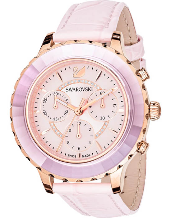 Женские часы Swarovski Octea Lux Chrono 5452501 – это роскошные часы с секундомеромСекундомерСекундоме́р — прибор, способный измерять интервалы времени с точностью до долей секунды. и хронографомХронографФункция позволяет измерять отрезки времени с особой точностью: часы, минуты, секунды. Верным признаком хронографа является наличие на циферблате 3 дополнительных окошек-счётчиков., поистине, образец точности и роскоши, ведь они сочетают в себе лучшие традиции швейцарского часового искусства и неповторимое мастерство Swarovski. Прекрасный аксессуар, подходящий к любому повседневному образу. Часы имеют функцию хронографаХронографФункция позволяет измерять отрезки времени с особой точностью: часы, минуты, секунды. Верным признаком хронографа является наличие на циферблате 3 дополнительных окошек-счётчиков., позволяющую запустить отсчет, остановить его и обнулить результаты. Корпус из нержавеющей стали с PVDPVDУльтратонкое покрытие наносится в технике вакуумного напыления, сочетает в себе нитрид титана особой прочности со слоем золота или оксида хрома. Несёт в себе декоративную или защитную функцию. покрытием оттенка розового золота гармонично сочетается с огранённым кристальным безелемБезельВнешний ободок, закрепляющий стекло. В спортивных часах так называется поворотное кольцо с делениями на циферблате, выполняет роль таймера – замеряет отрезки времени на шкале. Неподвижный безель – элемент декора. Однонаправленно вращающийся безель на дайверских часах позволяет фиксировать моменты погружения и выныривания на поверхность., который встречается только в коллекции часов Swarovski. Его светло-розовое сияние удачно сочетается с розовым циферблатом с рисунком в виде солнечных лучей и ремешком из натуральной кожи с тиснением под крокодила. Надежное минеральное стеклоМинеральное стеклоМинеральное стекло представляет собой искусственно выращенный минерал кварца. Такое стекло отличается особой устойчивостью к повреждениям и царапинам. Уступает по некоторым качествам сапфировому стеклу. защищает часы от царапин и долго сохраняет первоначальный внешний вид. На часовую, минутную стрелки нанесено люминесцентное покрытиеЛюминесцентное покрытиеПозволяет считывать показания времени в темноте. Производители наносят на стрелки, часовые индексы, безель или поверхность циферблата светонакопительный состав, дающий холодное свечение., которое светится в темноте, создавая необычное изображение.