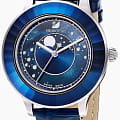 Женские часы Swarovski Octea Lux 5516305 – это специальный выпуск популярных часов Octea Lux приурочен к 50-летию первой высадки человека на Луну. Это первые часы Swarovski с полностью функциональным циферблатом, показывающим фазы Луны. Целая галактика прозрачных кристаллов сияет на фоне синего перламутрового циферблата. Он элегантно сочетается с кристальным безелемБезельВнешний ободок, закрепляющий стекло. В спортивных часах так называется поворотное кольцо с делениями на циферблате, выполняет роль таймера – замеряет отрезки времени на шкале. Неподвижный безель – элемент декора. Однонаправленно вращающийся безель на дайверских часах позволяет фиксировать моменты погружения и выныривания на поверхность. тёмного оттенка индиго с PVDPVDУльтратонкое покрытие наносится в технике вакуумного напыления, сочетает в себе нитрид титана особой прочности со слоем золота или оксида хрома. Несёт в себе декоративную или защитную функцию. покрытием и синим ремешком из натуральной кожи с тиснением под крокодила. Надежное минеральное стеклоМинеральное стеклоМинеральное стекло представляет собой искусственно выращенный минерал кварца. Такое стекло отличается особой устойчивостью к повреждениям и царапинам. Уступает по некоторым качествам сапфировому стеклу. защищает часы от царапин и долго сохраняет первоначальный внешний вид.  Эти современные утончённые часы преобразят любой повседневный образ.