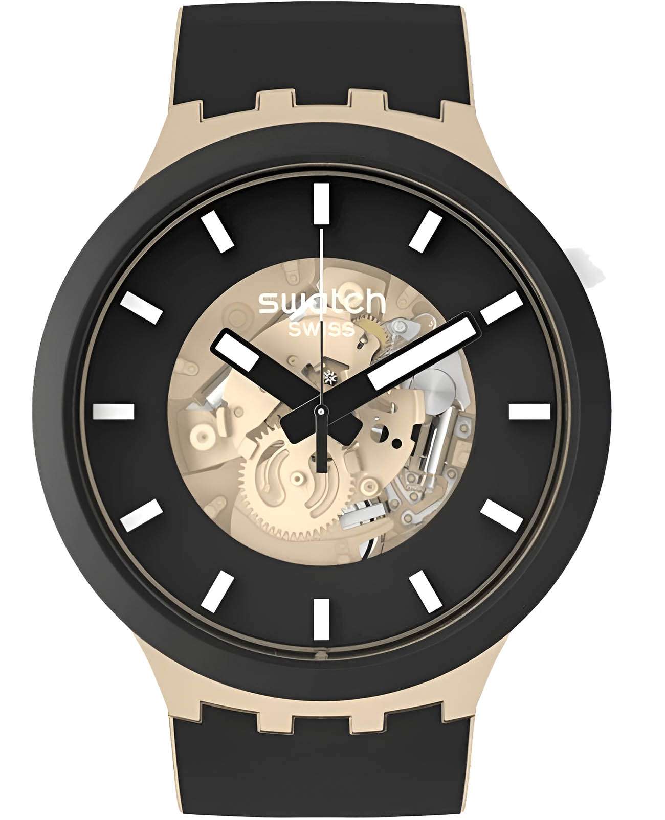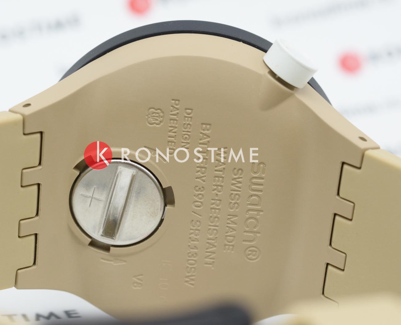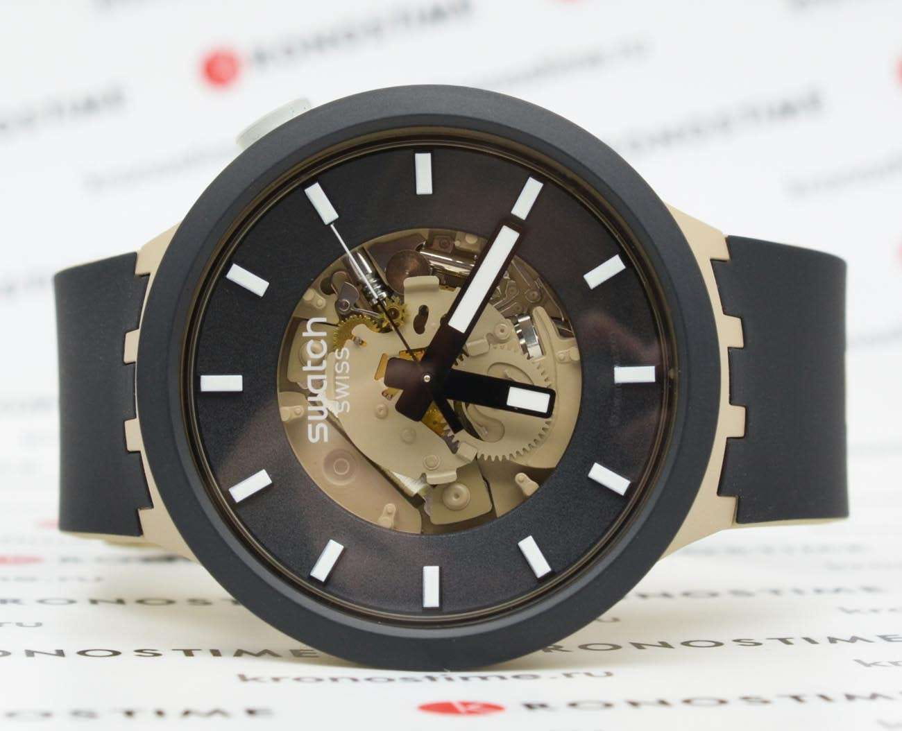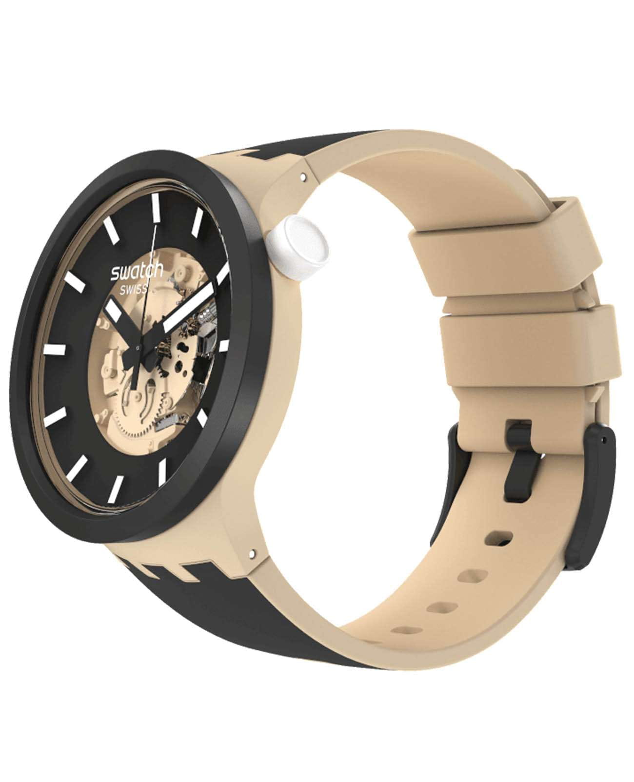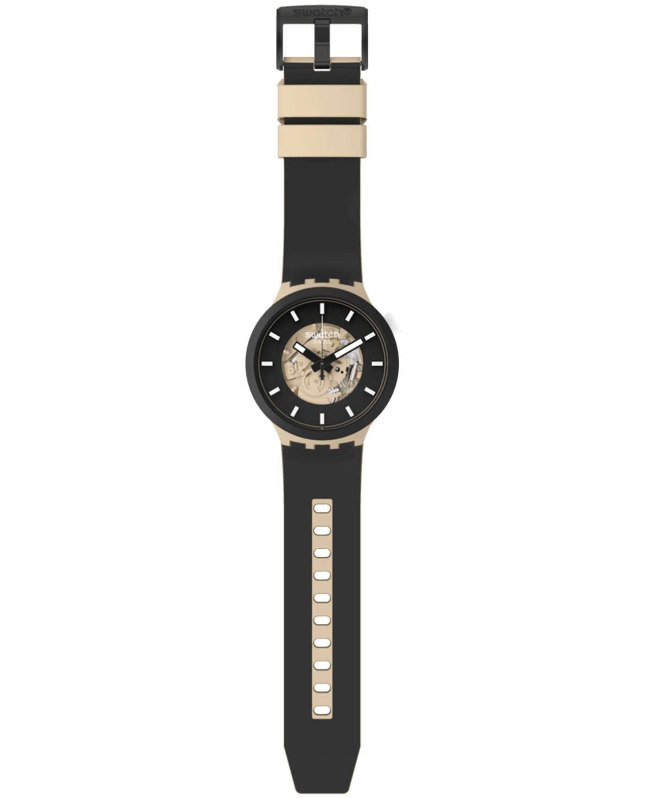 Часы Swatch SB03C100 — это стильный и современный аксессуар для тех, кто ценит лёгкость и комфорт. Часы идеально подойдут как для мужчин, так и для женщин. Центральный элемент этой модели часов — большой корпус со стеклом из био-материала, украшенный 3D-циферблатом с принтами на индексах. Корпус и безельБезельВнешний ободок, закрепляющий стекло. В спортивных часах так называется поворотное кольцо с делениями на циферблате, выполняет роль таймера – замеряет отрезки времени на шкале. Неподвижный безель – элемент декора. Однонаправленно вращающийся безель на дайверских часах позволяет фиксировать моменты погружения и выныривания на поверхность. из биокерамикиБиокерамикаБиокерамика — это материал, который на две трети состоит из керамики, на одну треть — из биопластика. Он сочетает в себе лучшие качества обоих материалов и обладает прочностью и шелковистой на ощупь текстурой., а также силиконовые тренчики подчеркивают бежевый принт на силиконовом ремешке этих огромных часов. На часовую, минутную стрелки нанесено люминесцентное покрытиеЛюминесцентное покрытиеПозволяет считывать показания времени в темноте. Производители наносят на стрелки, часовые индексы, безель или поверхность циферблата светонакопительный состав, дающий холодное свечение., которое светится в темноте, создавая необычное изображение.  Водозащита 30 метров делает часы практичными для повседневного использования. Эти часы подойдут для повседневного ношения и станут ярким акцентом в вашем наряде.