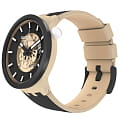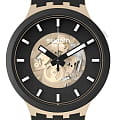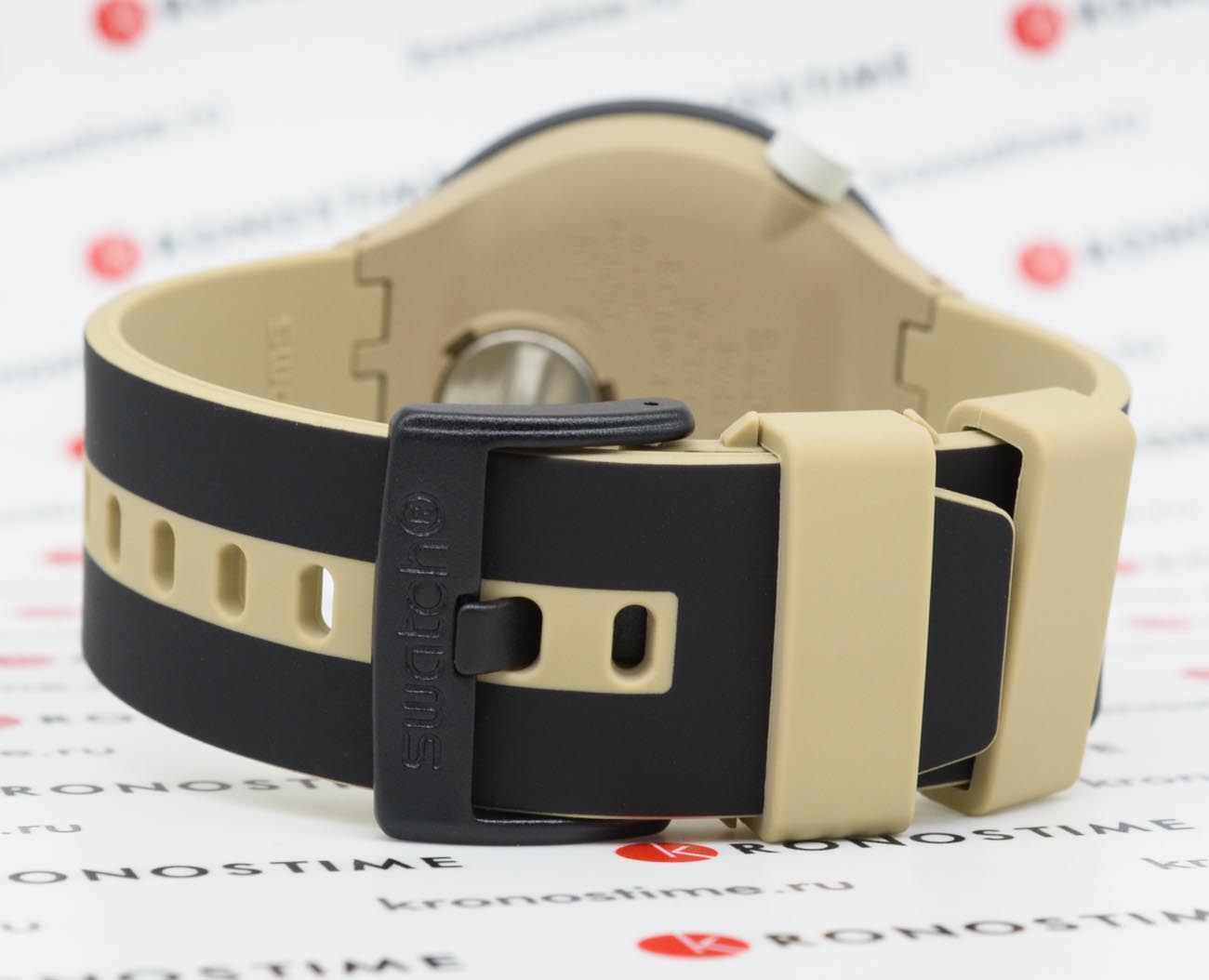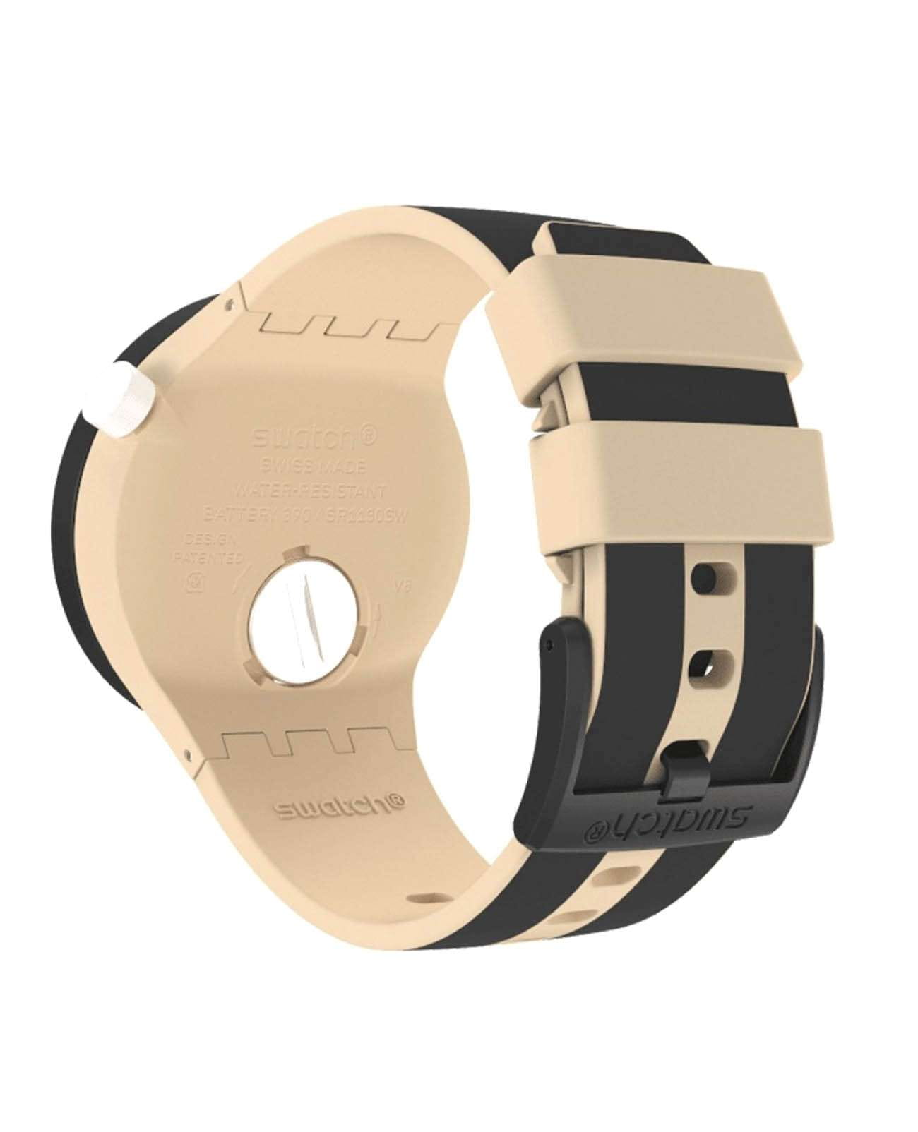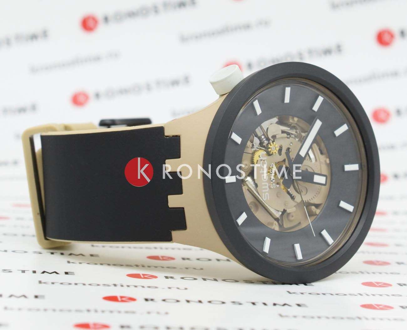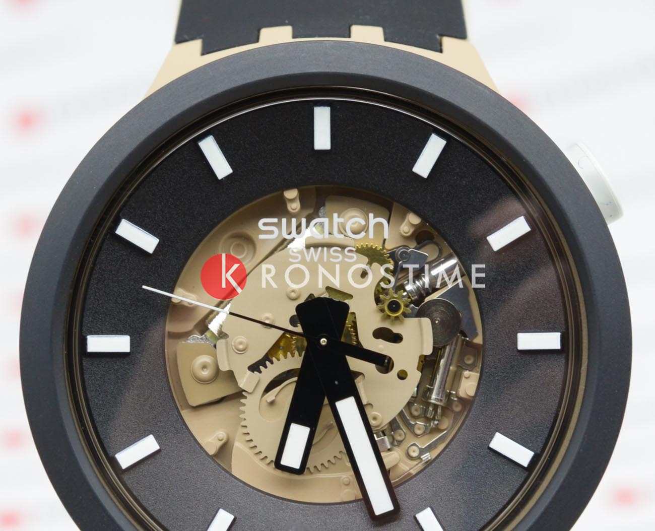 Часы Swatch SB03C100 — это стильный и современный аксессуар для тех, кто ценит лёгкость и комфорт. Часы идеально подойдут как для мужчин, так и для женщин. Центральный элемент этой модели часов — большой корпус со стеклом из био-материала, украшенный 3D-циферблатом с принтами на индексах. Корпус и безельБезельВнешний ободок, закрепляющий стекло. В спортивных часах так называется поворотное кольцо с делениями на циферблате, выполняет роль таймера – замеряет отрезки времени на шкале. Неподвижный безель – элемент декора. Однонаправленно вращающийся безель на дайверских часах позволяет фиксировать моменты погружения и выныривания на поверхность. из биокерамикиБиокерамикаБиокерамика — это материал, который на две трети состоит из керамики, на одну треть — из биопластика. Он сочетает в себе лучшие качества обоих материалов и обладает прочностью и шелковистой на ощупь текстурой., а также силиконовые тренчики подчеркивают бежевый принт на силиконовом ремешке этих огромных часов. На часовую, минутную стрелки нанесено люминесцентное покрытиеЛюминесцентное покрытиеПозволяет считывать показания времени в темноте. Производители наносят на стрелки, часовые индексы, безель или поверхность циферблата светонакопительный состав, дающий холодное свечение., которое светится в темноте, создавая необычное изображение.  Водозащита 30 метров делает часы практичными для повседневного использования. Эти часы подойдут для повседневного ношения и станут ярким акцентом в вашем наряде.
