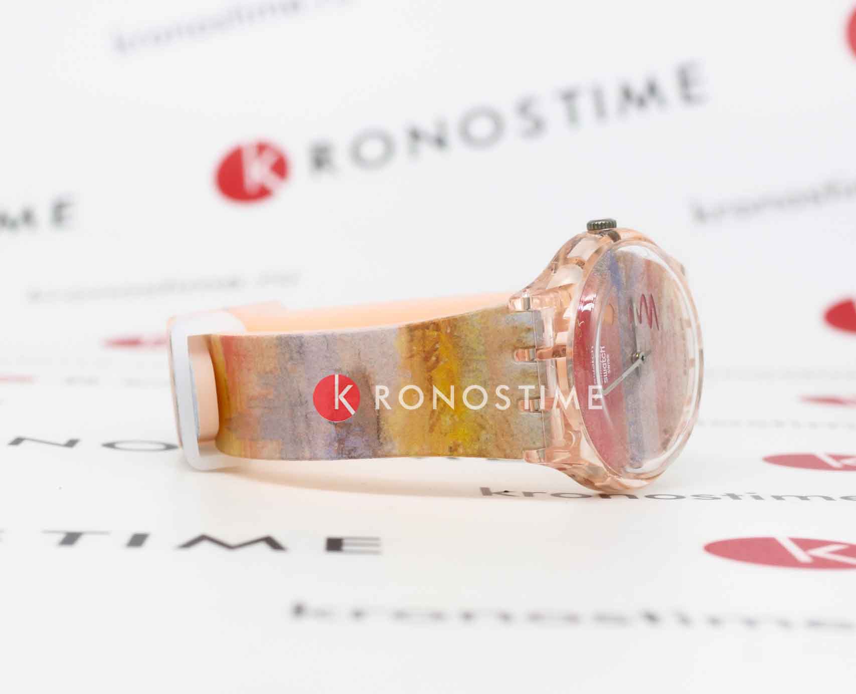 Часы Swatch SO28Z700 — эффектный и надежный аксессуар. Эти часы из коллекции Swatch x Tate Gallery обладают прозрачным глянцево-розовым корпусом и стеклом из биоматериала. Циферблат и матово-розовый ремешок украшены принтом с репродукцией картины Тёрнера (JMW Turner) «Алый закат» («The Scarlet Sunset»). Время отсчитывают серебристые стрелки с люминесцентным покрытиемЛюминесцентное покрытиеПозволяет считывать показания времени в темноте. Производители наносят на стрелки, часовые индексы, безель или поверхность циферблата светонакопительный состав, дающий холодное свечение., которые светятся в темноте, а солнце на циферблате меняет цвет в течение дня благодаря разноцветному календарному колесу. На прозрачном матовом ремешке расположен логотип Tate Gallery. Ремешок из силикона на стандартной застёжке. Внутри часов установлен надежный кварцевый механизм, который обеспечивает точность хода. Эти часы водонепроницаемы до 30 метров, что позволяет не беспокоиться о случайных брызгах или дождевых каплях. Swatch SO28Z700 — это идеальный выбор для тех, кто ценит сочетание стиля, комфорта и функциональности в одном аксессуаре.
