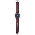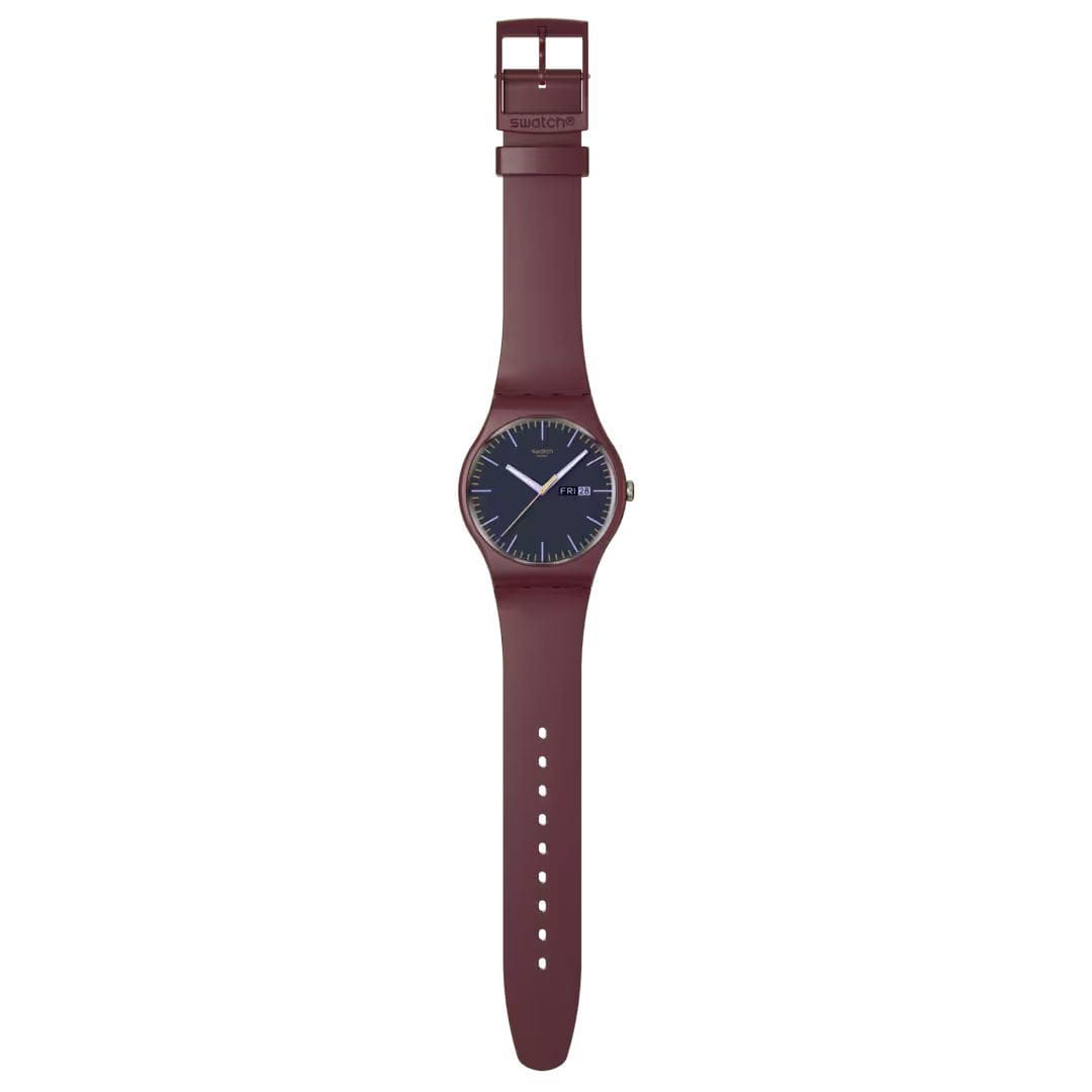 Часы Swatch SO29R707 —  стильный и надежный аксессуар. У них темно-коричневый циферблат со светло-фиолетовыми индексами, светло-коричневой минутной шкалой и окном даты и дня недели на 3 часах. Часовая и минутная стрелки имеют люминесцентное покрытиеЛюминесцентное покрытиеПозволяет считывать показания времени в темноте. Производители наносят на стрелки, часовые индексы, безель или поверхность циферблата светонакопительный состав, дающий холодное свечение., с эффектом свечения в темноте, а секундная стрелка цвета розового золота, под стеклом из биоматериала. Матовый бордовый корпус из биоматериала в сочетании с ремешком, петлей и пряжкой также из биопластика завершает дизайн часов. Эти часы водонепроницаемы до 30 метров, что позволяет не беспокоиться о случайных брызгах или дождевых каплях. Swatch SO29R707 — это идеальный выбор для тех, кто ценит сочетание стиля, комфорта и функциональности в одном аксессуаре.