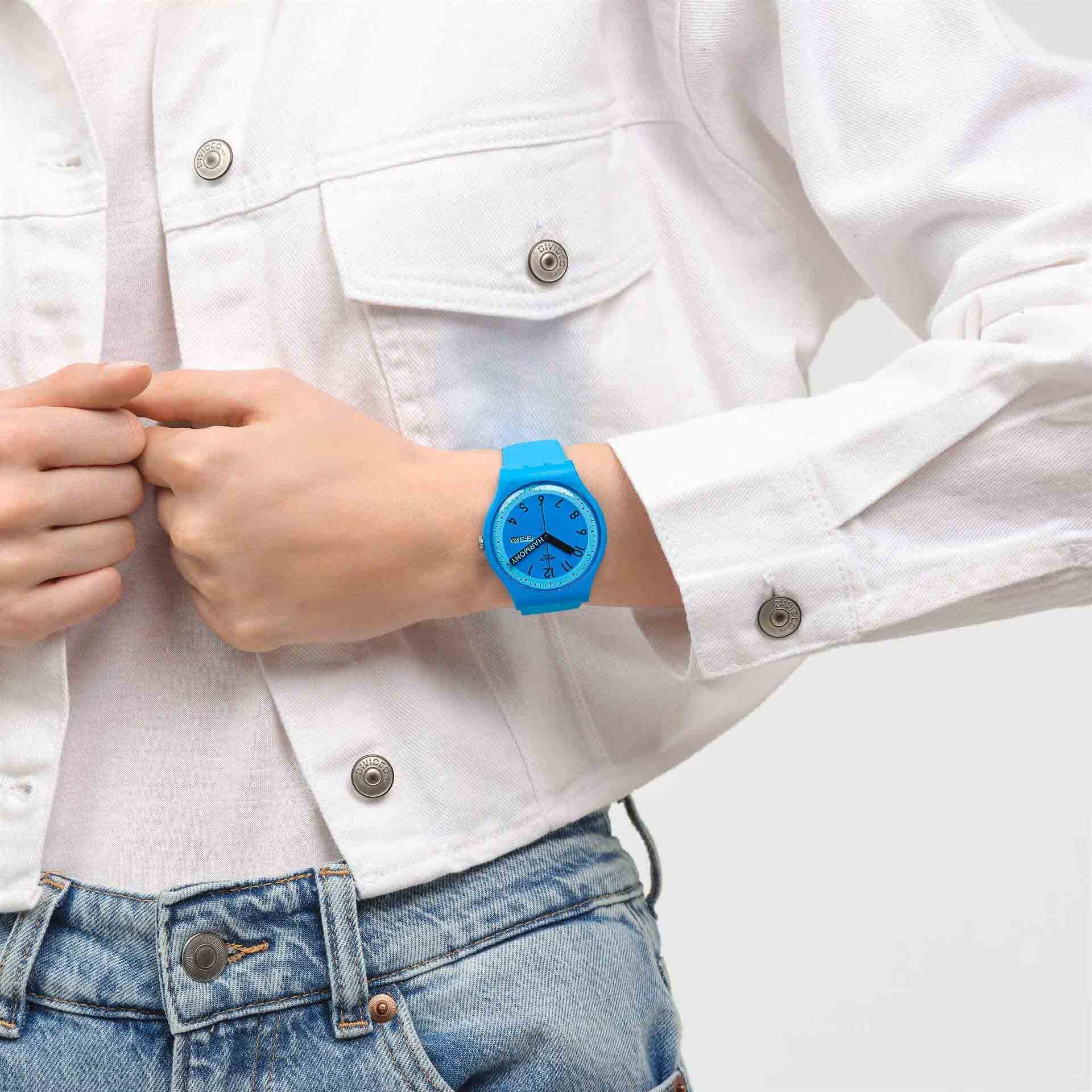 Часы Swatch SO29S702 — стильный и надежный аксессуар. Эти часы Swatch Pride 2023 Special отличаются циферблатом с черным принтом и голубым стеклом из биоматериалов, а также корпусом из тех же материалов. Часовая и минутная стрелки выполнены в черном цвете, при этом минутная стрелка символизирует значение голубого цвета в флаге Прайда: гармония. Ремешок этих ярко-голубых часов дополнен двумя специальными петлями, которые, соединяясь, образуют радугу. Ремешок силиконовый на классической застежке. Имеется окошко даты и дня недели в положении 3 часа. Внутри часов установлен надежный кварцевый механизм, который обеспечивает точность хода. Эти часы водонепроницаемы до 30 метров, что позволяет не беспокоиться о случайных брызгах или дождевых каплях. Swatch SO29S702 — это идеальный выбор для тех, кто ценит сочетание стиля, комфорта и функциональности в одном аксессуаре.