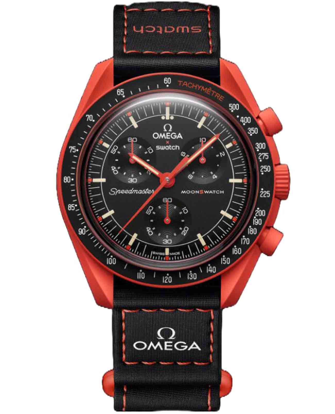 Часы Swatch Bioceramic Moonswatch MISSION ON EARTH - LAVA SO33O100 — это стильный и современный аксессуар для тех, кто ценит лёгкость и комфорт. Корпус диаметром 42 мм и пряжка этих уникальных часов изготовлены из биокерамикиБиокерамикаБиокерамика — это материал, который на две трети состоит из керамики, на одну треть — из биопластика. Он сочетает в себе лучшие качества обоих материалов и обладает прочностью и шелковистой на ощупь текстурой.. Модель оснащена черным циферблатом и черным биокерамическим безелемБезельВнешний ободок, закрепляющий стекло. В спортивных часах так называется поворотное кольцо с делениями на циферблате, выполняет роль таймера – замеряет отрезки времени на шкале. Неподвижный безель – элемент декора. Однонаправленно вращающийся безель на дайверских часах позволяет фиксировать моменты погружения и выныривания на поверхность. с нанесенной на него шкалой тахиметраТахиметрРазмеченная шкала, располагается на ободке или безеле часов. Тахиметр позволяет рассчитать скорость на определённом участке пути, расстояние измеряется в километрах или милях., а также черным ремешком с липучкой VELCRO®. Часовые отметки, часовая и минутная стрелки, а также кончик секундной стрелки хронографаХронографФункция позволяет измерять отрезки времени с особой точностью: часы, минуты, секунды. Верным признаком хронографа является наличие на циферблате 3 дополнительных окошек-счётчиков. покрыты люминесцентным покрытиемЛюминесцентное покрытиеПозволяет считывать показания времени в темноте. Производители наносят на стрелки, часовые индексы, безель или поверхность циферблата светонакопительный состав, дающий холодное свечение. Super-LumiNova® класса А, благодаря чему они прекрасно светятся в темноте. На циферблатах всех часов данной коллекции присутствуют логотип OMEGA X Swatch, культовый логотип Speedmaster и логотип MoonSwatch. Общими характеристиками всех моделей являются объемная конструкция стекла из биоматериала с выгравированной по центру буквой «S», тонкий и изящный круговой узор на внешнем кольце циферблата и заглубленных мини-циферблатах, гладкие ушки с заостренными концами, культовая точка над отметкой 90 на тахиметрической шкале и, конечно же, уникальный материал – биокерамика.