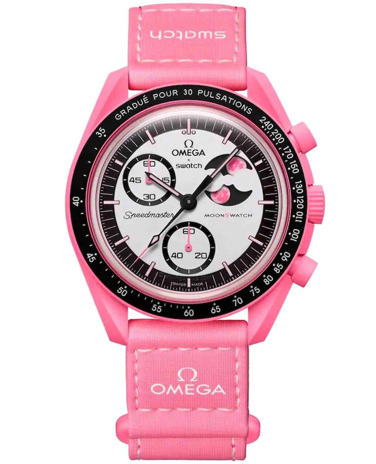 Швейцарские женские часы Swatch x Omega Bioceramic Moonswatch Mission to The Pink Moonphase SO33P700 с хронографом