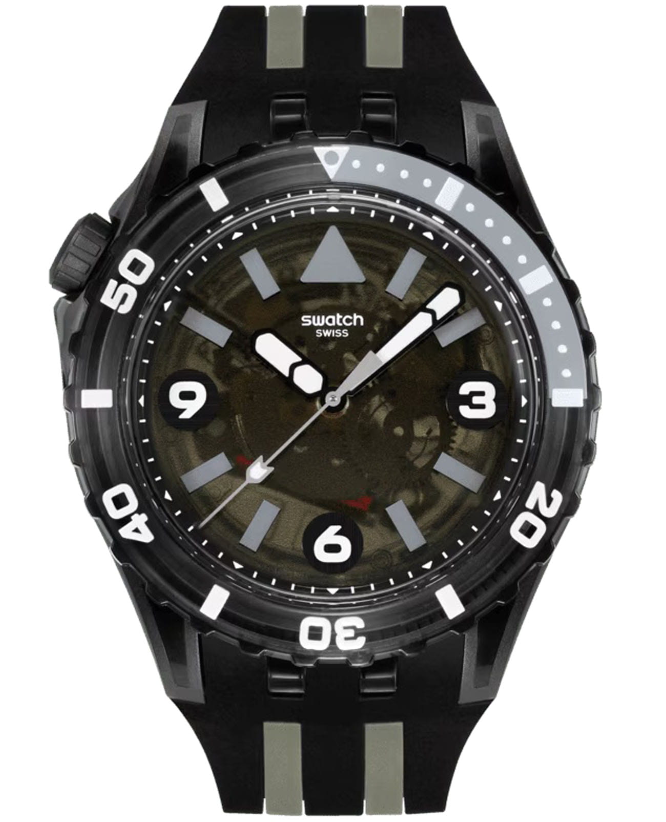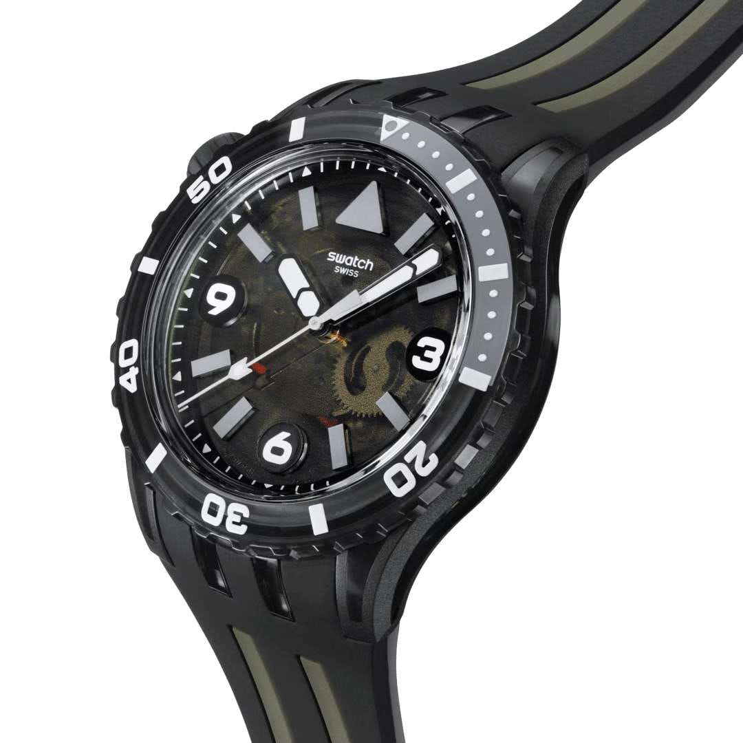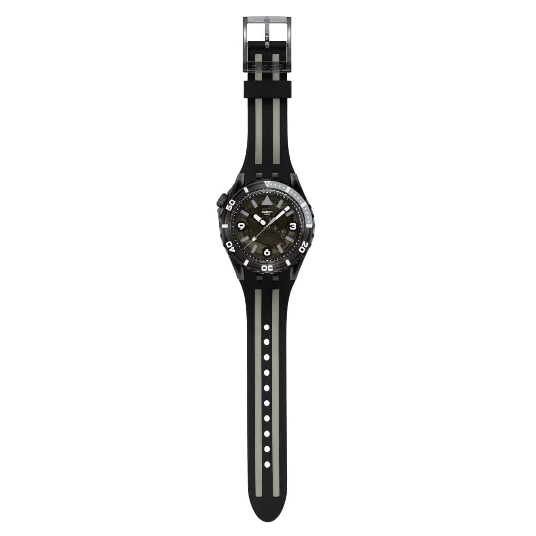 Мужские дайверские часы Swatch BLACK SEA NETTLE SSCU09B100 — это стильный и современный аксессуар для тех, кто ценит лёгкость и комфорт. Корпус выполнен из биокерамики, который состоит из матовых и блестящих прозрачных частей из биоматериала, диаметром 44 мм и толщиной 15.4 мм, что обеспечивает долговечность и утончённый внешний вид. Циферблат защищён органическим стеклом, устойчивым к повреждениям. Модель оснащена кварцевым механизмом, обеспечивающим высокую точность хода. БезельБезельВнешний ободок, закрепляющий стекло. В спортивных часах так называется поворотное кольцо с делениями на циферблате, выполняет роль таймера – замеряет отрезки времени на шкале. Неподвижный безель – элемент декора. Однонаправленно вращающийся безель на дайверских часах позволяет фиксировать моменты погружения и выныривания на поверхность. из черного просвечивающего биоматериала с серо-белым принтом, светящимся в темноте, и черная матовая заводная головка из биокерамики, размещенная в районе отметки 10 часов. Стрелки и метки с люминесцентным покрытиемЛюминесцентное покрытиеПозволяет считывать показания времени в темноте. Производители наносят на стрелки, часовые индексы, безель или поверхность циферблата светонакопительный состав, дающий холодное свечение.. Силиконовый ремешок на стандартной застёжке гармонично дополняет корпус и обеспечивает комфортное ношение. Водозащита 100 метров позволит плавать, нырять и заниматься другими водными видами спорта. Эти часы подойдут для повседневного ношения и станут ярким акцентом в вашем наряде.