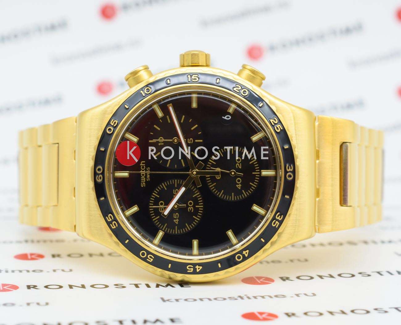 Часы Swatch YVG418G — это стильный и современный аксессуар для тех, кто ценит лёгкость и комфорт. Своеобразную выразительность этому золотистому хронографуХронографФункция позволяет измерять отрезки времени с особой точностью: часы, минуты, секунды. Верным признаком хронографа является наличие на циферблате 3 дополнительных окошек-счётчиков. придает черный циферблат с радиальной шлифовкой, на котором размещены золотистые цифры и стрелки с люминесцентным покрытиемЛюминесцентное покрытиеПозволяет считывать показания времени в темноте. Производители наносят на стрелки, часовые индексы, безель или поверхность циферблата светонакопительный состав, дающий холодное свечение.. Полированный корпус с золотым PVDPVDУльтратонкое покрытие наносится в технике вакуумного напыления, сочетает в себе нитрид титана особой прочности со слоем золота или оксида хрома. Несёт в себе декоративную или защитную функцию. покрытием закреплен на таком же регулируемом браслете с застёжкой «бабочка»Застёжка "бабочка"Такой вид застёжки дополняется предохранителями, помогающими избежать случайного раскрытия браслета. Обладают изящным исполнением. . Водозащита 30 метров делает часы практичными для повседневного использования. Эти часы подойдут для повседневного ношения и станут ярким акцентом в вашем наряде.