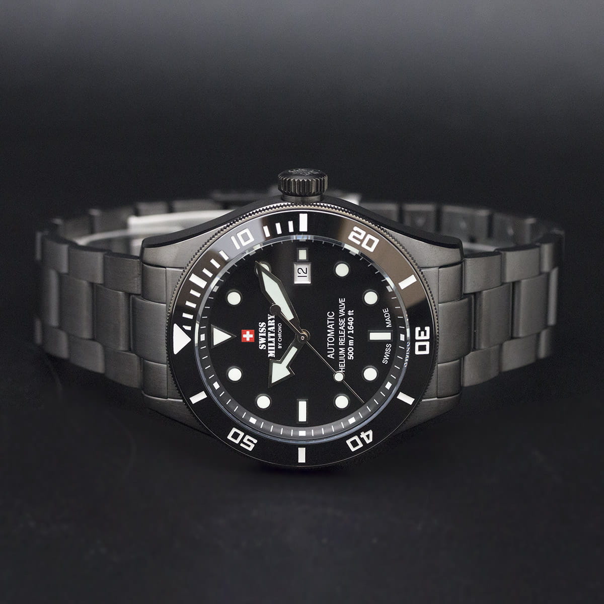 Мужские швейцарские наручные часы Swiss Military by Chrono Diver SMA34075.04, механический механизм (автоматический калибр) с высокой точностью. Сапфировое стекло устойчивое к появлению царапин, обладающее высокой прозрачностью.Корпус часов изготовлен из стали, черного цвета.