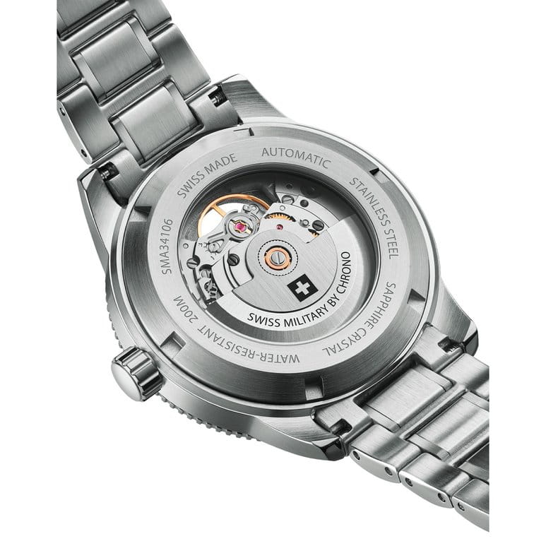 Модель SMA34106.11 от Swiss Military by Chrono сочетает профессиональные характеристики дайверских часов с классическим швейцарским качеством. Корпус и браслет выполнены из нержавеющей стали. Циферблат с метками, покрытыми люминесцентным покрытиемЛюминесцентное покрытиеПозволяет считывать показания времени в темноте. Производители наносят на стрелки, часовые индексы, безель или поверхность циферблата светонакопительный состав, дающий холодное свечение., обеспечивает отличную читаемость в темноте. Механизм с автоматическим подзаводом обеспечивает стабильную работу с запасом хода до 38 часов. Циферблат защищён сапфировым стекломСапфировое стеклоПрочный и надёжный материал из кристалла сапфира синтетического происхождения, характеризующийся особой твёрдостью и устойчивостью к царапинам и повреждениям. с антибликовым покрытиемАнтибликовое покрытиеСлой оксида металла в 0,13-0,3 микрон, благодаря которому стекло часов не бликует и не отражает свет. Антибликовое покрытие уменьшает отражение света в 10 раз, обеспечивая отличную читаемость показателей циферблата.. Установлена раскладная застёжкаРаскладная застёжкаТакой тип застёжки используется только на браслетах из металла. Она никогда не раскрывается полностью, происходит разделение на 2 и более частей. Раскладывающая застёжка снизит вероятность потери часов к минимуму. для надёжной фиксации. Односторонний вращающийся безель с PVD-покрытиемPVDУльтратонкое покрытие наносится в технике вакуумного напыления, сочетает в себе нитрид титана особой прочности со слоем золота или оксида хрома. Несёт в себе декоративную или защитную функцию. позволяет точно отслеживать время погружения. Водонепроницаемость до 200 метров делает модель подходящей для дайвинга.