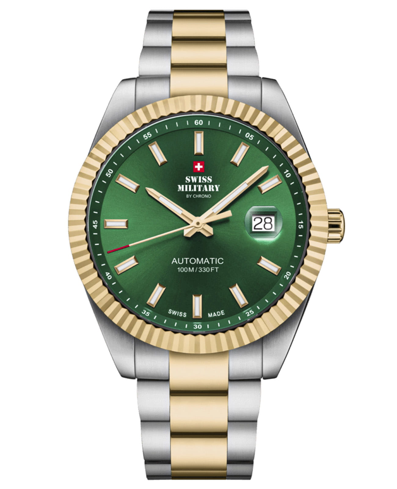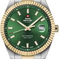Мужские механические часы с автоподзаводом Swiss Military — это прочный и изысканный аксессуар. Корпус диаметром 40 мм и толщиной 10,8 мм выполнен из нержавеющей стали. БезельБезельВнешний ободок, закрепляющий стекло. В спортивных часах так называется поворотное кольцо с делениями на циферблате, выполняет роль таймера – замеряет отрезки времени на шкале. Неподвижный безель – элемент декора. Однонаправленно вращающийся безель на дайверских часах позволяет фиксировать моменты погружения и выныривания на поверхность. с PVD-покрытиемPVDУльтратонкое покрытие наносится в технике вакуумного напыления, сочетает в себе нитрид титана особой прочности со слоем золота или оксида хрома. Несёт в себе декоративную или защитную функцию.. Циферблат зелёного цвета оформлен индексами, стрелками и апертурой даты в положении 3 часов с увеличительным стеклом (Cyclops). Стрелки и метки с люминесцентным покрытиемЛюминесцентное покрытиеПозволяет считывать показания времени в темноте. Производители наносят на стрелки, часовые индексы, безель или поверхность циферблата светонакопительный состав, дающий холодное свечение., обеспечивающим хорошую читаемость в темноте. Циферблат защищён сапфировым стекломСапфировое стеклоПрочный и надёжный материал из кристалла сапфира синтетического происхождения, характеризующийся особой твёрдостью и устойчивостью к царапинам и повреждениям.. Механизм — швейцарское автоматическое движение калибра Sellita SW200 (Swiss Made). Часы оснащены стальным браслетом с частичным PVD-покрытиемPVDУльтратонкое покрытие наносится в технике вакуумного напыления, сочетает в себе нитрид титана особой прочности со слоем золота или оксида хрома. Несёт в себе декоративную или защитную функцию. на раскладной застёжкеРаскладная застёжкаТакой тип застёжки используется только на браслетах из металла. Она никогда не раскрывается полностью, происходит разделение на 2 и более частей. Раскладывающая застёжка снизит вероятность потери часов к минимуму.. Водонепроницаемость 100 м позволяет использовать часы для плавания и повседневного ношения. Идеальный выбор для тех, кто ценит швейцарское качество и универсальный дизайн.