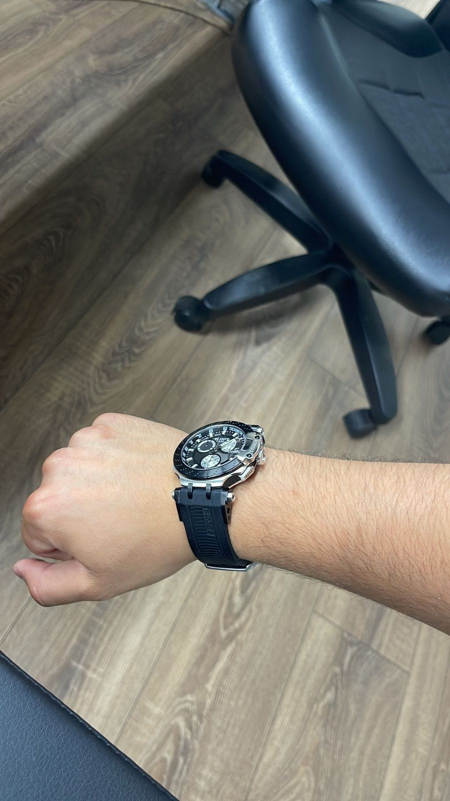 Оригинальный аксессуар в чёрно-серебряном цвете обладает характерными крупными деталями, идёт отсылка к деталям гоночных мотоциклов. Задняя крышка корпуса сделана в виде колеса, безельБезельВнешний ободок, закрепляющий стекло. В спортивных часах так называется поворотное кольцо с делениями на циферблате, выполняет роль таймера – замеряет отрезки времени на шкале. Неподвижный безель – элемент декора. Однонаправленно вращающийся безель на дайверских часах позволяет фиксировать моменты погружения и выныривания на поверхность. напоминает тормозную колодку. Наручные часы оснащены кварцевым механизмом швейцарского производства ETA G10.212. ХронографХронографФункция позволяет измерять отрезки времени с особой точностью: часы, минуты, секунды. Верным признаком хронографа является наличие на циферблате 3 дополнительных окошек-счётчиков. позволяет измерять показатели с особой точностью. Чёрное PVD-покрытиеPVDУльтратонкое покрытие наносится в технике вакуумного напыления, сочетает в себе нитрид титана особой прочности со слоем золота или оксида хрома. Несёт в себе декоративную или защитную функцию. корпуса. Сапфировое стекло. Водостойкость при давлении 10 бар. Секундомер, индикация даты. Люминесцентная подсветкаЛюминесцентное покрытиеПозволяет считывать показания времени в темноте. Производители наносят на стрелки, часовые индексы, безель или поверхность циферблата светонакопительный состав, дающий холодное свечение.. Габариты: 47,6 x 43 x 12,3 мм.