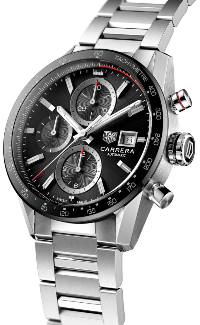 Автоматический гоночный хронограф Calibre 16 с черными основным и вспомогательными циферблатами, стальным корпусом с матовыми и полированными поверхностями и неподвижным черным керамическим безелем с тахиметрической шкалой. Красные акценты на корпусе и циферблате усиливают спортивный дизайн модели. TAG Heuer Carrera CBM2110.BA0651, механический механизм (автоматический калибр) с высокой точностью. Сапфировое стекло устойчивое к появлению царапин, обладающее высокой прозрачностью. Класс водозащиты: 100 метров, позволит плавать, нырять и заниматься другими водными видами спорта. Корпус часов изготовлен из стали, цвета.