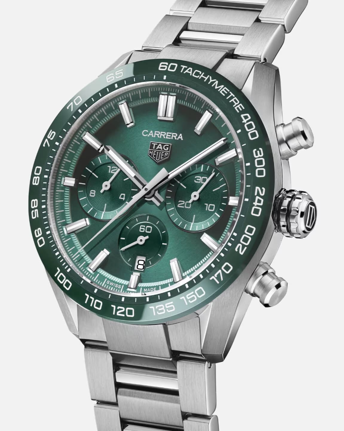 Мужские швейцарские наручные часы-хронографХронографФункция позволяет измерять отрезки времени с особой точностью: часы, минуты, секунды. Верным признаком хронографа является наличие на циферблате 3 дополнительных окошек-счётчиков. TAG Heuer Carrera CBN2A1N.BA0643 с надёжным автоматическим механизмом. Корпус и браслет часов изготовлены из нержавеющей стали. Окошко даты находится в положении 6 часов. Сапфировое стеклоСапфировое стеклоПрочный и надёжный материал из кристалла сапфира синтетического происхождения, характеризующийся особой твёрдостью и устойчивостью к царапинам и повреждениям. устойчивое к мелким механическим повреждениям. Стрелки и метки с люминесцентным покрытиемЛюминесцентное покрытиеПозволяет считывать показания времени в темноте. Производители наносят на стрелки, часовые индексы, безель или поверхность циферблата светонакопительный состав, дающий холодное свечение.. Стальной браслет на раскладной застёжкеРаскладная застёжкаТакой тип застёжки используется только на браслетах из металла. Она никогда не раскрывается полностью, происходит разделение на 2 и более частей. Раскладывающая застёжка снизит вероятность потери часов к минимуму.. Класс водозащиты: 100 метров, позволит плавать, нырять и заниматься другими водными видами спорта. Керамический безельБезельВнешний ободок, закрепляющий стекло. В спортивных часах так называется поворотное кольцо с делениями на циферблате, выполняет роль таймера – замеряет отрезки времени на шкале. Неподвижный безель – элемент декора. Однонаправленно вращающийся безель на дайверских часах позволяет фиксировать моменты погружения и выныривания на поверхность. с PVD-покрытиемPVDУльтратонкое покрытие наносится в технике вакуумного напыления, сочетает в себе нитрид титана особой прочности со слоем золота или оксида хрома. Несёт в себе декоративную или защитную функцию. и шкалой тахиметраТахиметрРазмеченная шкала, располагается на ободке или безеле часов. Тахиметр позволяет рассчитать скорость на определённом участке пути, расстояние измеряется в километрах или милях..