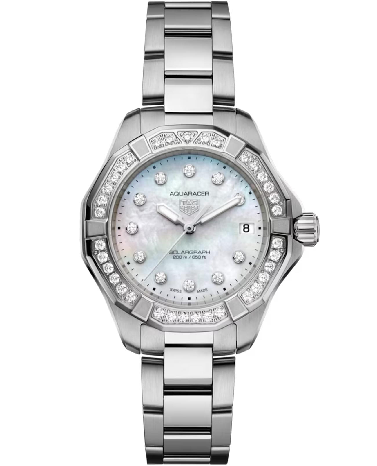Женские швейцарские наручные кварцевые часы на солнечной батарейке TAG Heuer Aquaracer Professional Solargraph WBP1312.BA0005. Сапфировое стеклоСапфировое стеклоПрочный и надёжный материал из кристалла сапфира синтетического происхождения, характеризующийся особой твёрдостью и устойчивостью к царапинам и повреждениям. устойчивое к появлению царапин, обладающее высокой прозрачностью. Стрелки и метки с люминесцентным покрытиемЛюминесцентное покрытиеПозволяет считывать показания времени в темноте. Производители наносят на стрелки, часовые индексы, безель или поверхность циферблата светонакопительный состав, дающий холодное свечение. Super-LumiNova. Класс водозащиты: 200 метров, позволит плавать, нырять и заниматься другими водными видами спорта. Корпус часов изготовлен из нержавеющей стали. Браслет с раскладной застёжкойРаскладная застёжкаТакой тип застёжки используется только на браслетах из металла. Она никогда не раскрывается полностью, происходит разделение на 2 и более частей. Раскладывающая застёжка снизит вероятность потери часов к минимуму.. Вращающийся стальной безельБезельВнешний ободок, закрепляющий стекло. В спортивных часах так называется поворотное кольцо с делениями на циферблате, выполняет роль таймера – замеряет отрезки времени на шкале. Неподвижный безель – элемент декора. Однонаправленно вращающийся безель на дайверских часах позволяет фиксировать моменты погружения и выныривания на поверхность. и циферблат инкрустированы бриллиантами. Окошко даты находится в положении 3 часа.