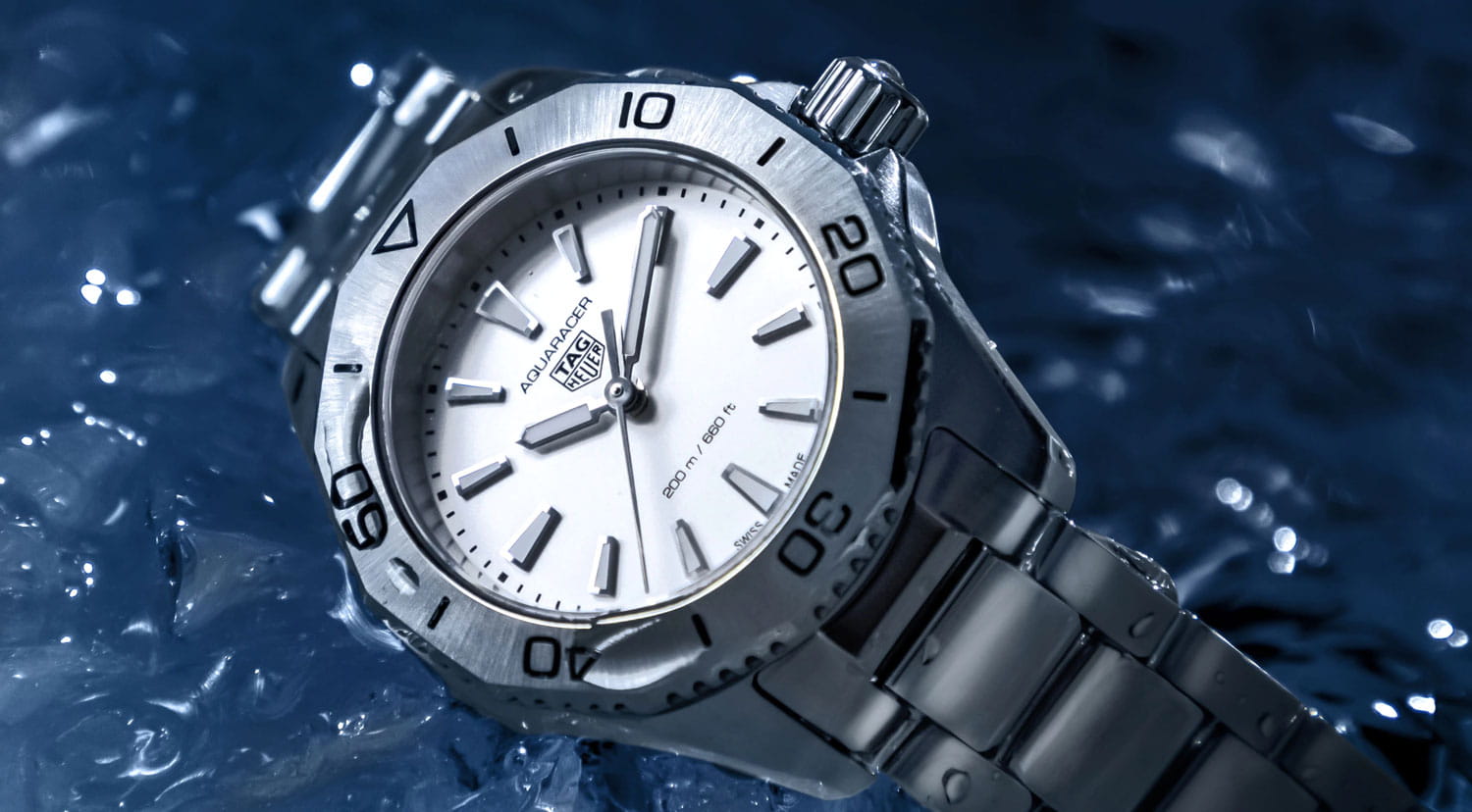 Женские швейцарские часы TAG Heuer Aquaracer Professional 200 WBP1411.BA0622, кварцевый механизм с высокой точностью. Сапфировое стеклоСапфировое стеклоПрочный и надёжный материал из кристалла сапфира синтетического происхождения, характеризующийся особой твёрдостью и устойчивостью к царапинам и повреждениям. устойчивое к появлению царапин, обладающее высокой прозрачностью. Класс водозащиты: 200 метров, позволит плавать, нырять и заниматься другими водными видами спорта. Корпус часов изготовлен из стали. Стальной браслет на раскладной застёжкеРаскладная застёжкаТакой тип застёжки используется только на браслетах из металла. Она никогда не раскрывается полностью, происходит разделение на 2 и более частей. Раскладывающая застёжка снизит вероятность потери часов к минимуму.. Стальной рифленый вращающийся 12-гранный безельБезельВнешний ободок, закрепляющий стекло. В спортивных часах так называется поворотное кольцо с делениями на циферблате, выполняет роль таймера – замеряет отрезки времени на шкале. Неподвижный безель – элемент декора. Однонаправленно вращающийся безель на дайверских часах позволяет фиксировать моменты погружения и выныривания на поверхность. с минутной шкалой выполнен с радиальным сатинированием поверхности. Циферблат выполнен по технологии Sunray (солнечные лучи). Метки в виде штрихов. Стрелки и метки с родиевым и люминесцентным покрытиемЛюминесцентное покрытиеПозволяет считывать показания времени в темноте. Производители наносят на стрелки, часовые индексы, безель или поверхность циферблата светонакопительный состав, дающий холодное свечение. Superluminova. Рифленая заводная головка с защитой. Задняя крышка украшена выгравированной 8-лучевой розой ветров на фоне узора сотовой структуры.