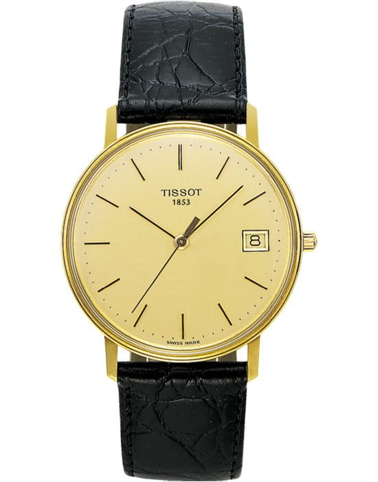 TISSOT T71340121 - мужские золотые кварцевые наручные часы Корпус этих часов среднего размера (33,7 мм) и выполнен из 18-каратного желтого золота Модель TISSOT T71340121 имеет устойчивое к царапинам сапфировое стекло, ремешок из натуральной кожи черного цвета, цвет циферблата шампань Калибр механизма: ETA 955112 Класс водозащиты: 30 м / 3 АТМ (защита от брызг и случайных капель) Дополнительные функции и особенности: отображение числа Полная заводская комплектация TISSOT: оригинальные часы, фирменная коробка, инструкция, сервисная книжка, роман о часовой фабрике, миникаталог, замшевый фирменный чехол черного цвета для хранения и/или переноски часов, кассовый и товарный чеки Международная гарантия 2 года Производство и сборка: Швейцария