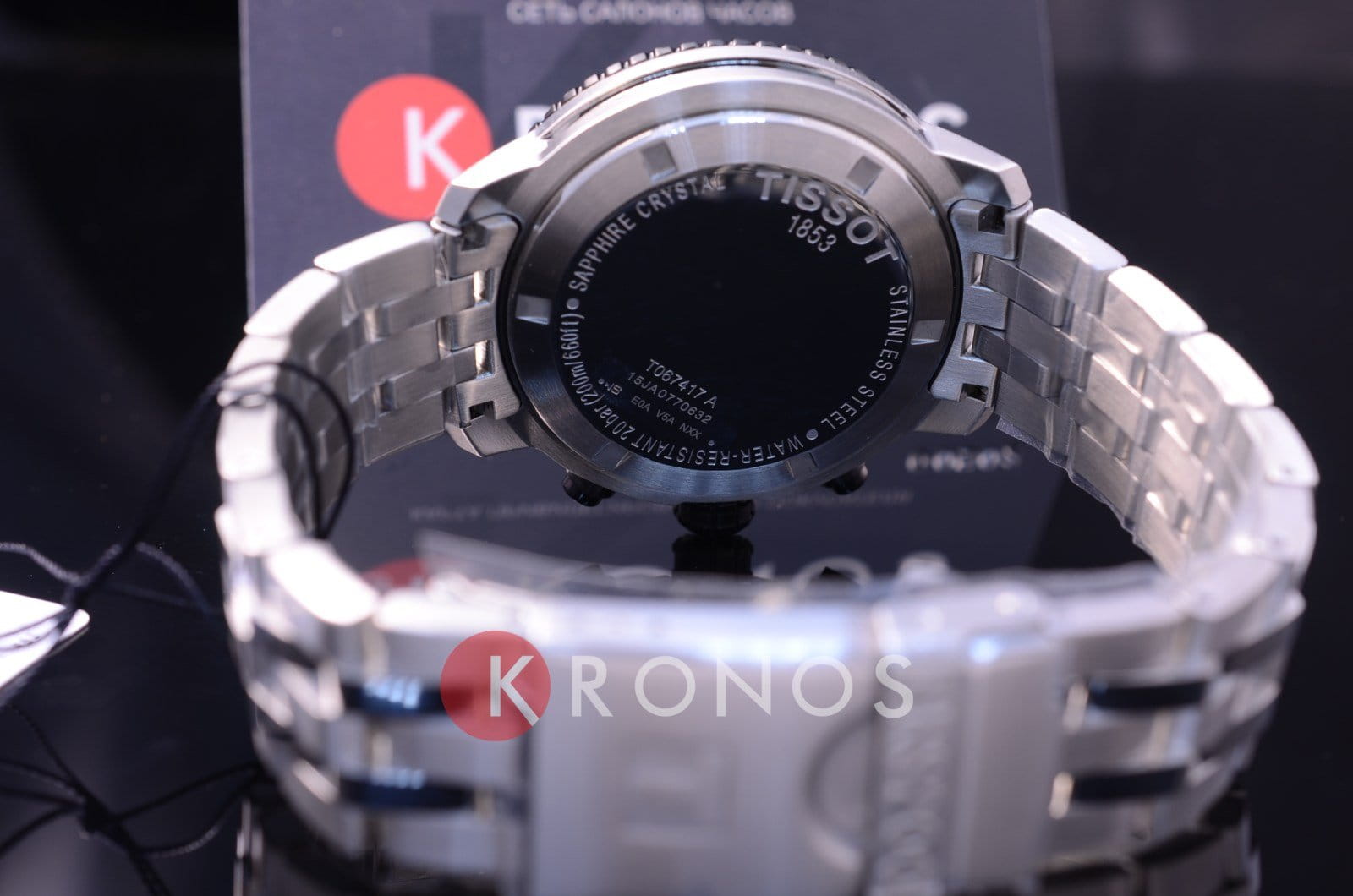 TISSOT T0674172105100 T-Sport PRS 200 Quartz Chronograph - мужские кварцевые наручные часы Корпус этих часов среднего размера (42 мм) и выполнен из нержавеющей стали L316 металлического цвета Модель TISSOT T0674172105100 T-Sport PRS 200 Quartz Chronograph имеет устойчивое к царапинам сапфировое стекло, браслет из нержавающей стали металлического цвета, черный циферблат Калибр механизма: ETA G10211 Класс водозащиты: 200 м / 20 АТМ (разрешается нырять с аквалангом на глубину) Дополнительные функции и особенности: отображение числа, хронограф (секундомер) Полная заводская комплектация TISSOT: оригинальные часы, фирменная коробка, инструкция, сервисная книжка, роман о часовой фабрике, миникаталог, замшевый фирменный чехол черного цвета для хранения и/или переноски часов, кассовый и товарный чеки Международная гарантия 2 года Производство и сборка: Швейцария