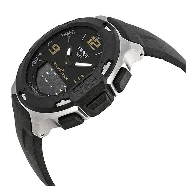 TISSOT T0814201705700 Touch Collection T-Race - мужские кварцевые наручные часы Корпус этих часов среднего размера (42 мм) и выполнен из нержавеющей стали L316 металлического цвета Модель TISSOT T0814201705700 Touch Collection T-Race имеет устойчивое к царапинам сапфировое стекло, ремешок из натурального каучука черного цвета, черный циферблат Калибр механизма: ETA E49301 Класс водозащиты: 100 м / 10 АТМ (разрешается плавание и ныряние без акваланга) Дополнительные функции и особенности: отображение числа, полностью автоматический календарь, второе время (GMT), будильник, хронограф (секундомер), таймер (обратный отсчет), отображение данных о приливах и отливах, компас, сенсорный дисплей Полная заводская комплектация TISSOT: оригинальные часы, фирменная коробка, инструкция, сервисная книжка, роман о часовой фабрике, миникаталог, замшевый фирменный чехол черного цвета для хранения и/или переноски часов, кассовый и товарный чеки Международная гарантия 2 года Производство и сборка: Швейцария