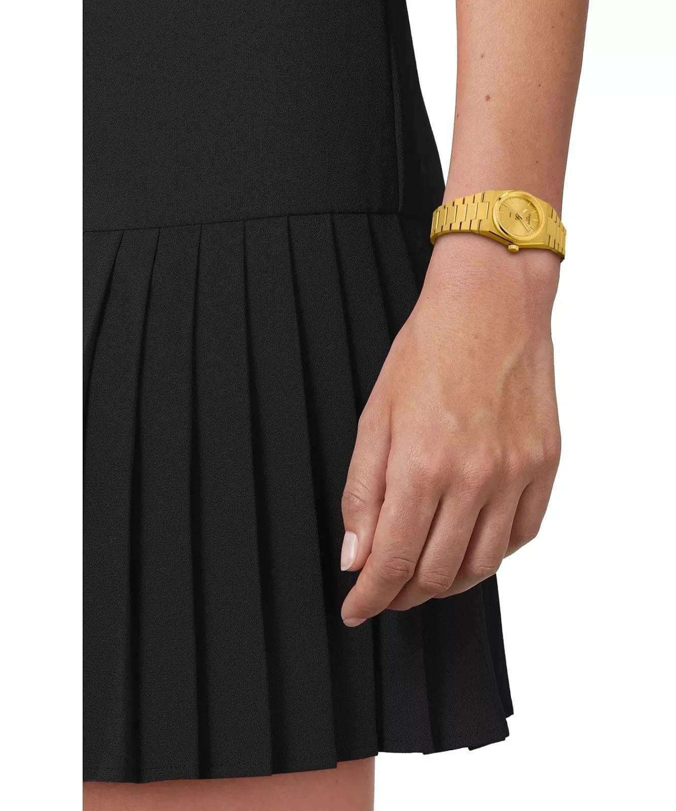 Мужские кварцевые часы Tissot PRX 25 мм T1370103302100 — это стильный аксессуар, вдохновлённый элегантностью 70-х годов. Модель выполнена в тонкой форме из нержавеющей стали 316L с PVD-покрытиемPVDУльтратонкое покрытие наносится в технике вакуумного напыления, сочетает в себе нитрид титана особой прочности со слоем золота или оксида хрома. Несёт в себе декоративную или защитную функцию. цвета жёлтого золота, что придаёт ей благородный внешний вид и устойчивость к царапинам. Циферблат шампанского цвета дополнен индексами, а его поверхность защищена сапфировым стекломСапфировое стеклоПрочный и надёжный материал из кристалла сапфира синтетического происхождения, характеризующийся особой твёрдостью и устойчивостью к царапинам и повреждениям. с антибликовым покрытиемАнтибликовое покрытиеСлой оксида металла в 0,13-0,3 микрон, благодаря которому стекло часов не бликует и не отражает свет. Антибликовое покрытие уменьшает отражение света в 10 раз, обеспечивая отличную читаемость показателей циферблата., устойчивым к повреждениям. Стрелки и метки имеют люминесцентное покрытиеЛюминесцентное покрытиеПозволяет считывать показания времени в темноте. Производители наносят на стрелки, часовые индексы, безель или поверхность циферблата светонакопительный состав, дающий холодное свечение. Super-LumiNova®, обеспечивающее отличную читаемость даже в условиях слабого освещения. Часы оснащены солнечным кварцевым механизмом швейцарского производства, который обеспечивает точную работу и минимальное обслуживание. Аккумулятор Renata 364 гарантирует длительную работу без подзарядки. Браслет из нержавеющей стали с покрытием цвета жёлтого золота оснащён Застёжка "бабочка"Застёжка "бабочка"Такой вид застёжки дополняется предохранителями, помогающими избежать случайного раскрытия браслета. Обладают изящным исполнением. , обеспечивающей комфорт и надёжную фиксацию на запястье. Ремешок является быстросменным, что позволяет легко менять его по желанию. Водонепроницаемость позволяет использовать модель при плавании и других водных активностях без глубокого погружения. Гарантия 2 года подтверждает качество и долговечность изделия. Эти часы станут универсальным аксессуаром для тех, кто ценит сочетание стиля, функциональности и швейцарского мастерства — идеальный выбор для повседневной носки и активного образа жизни.