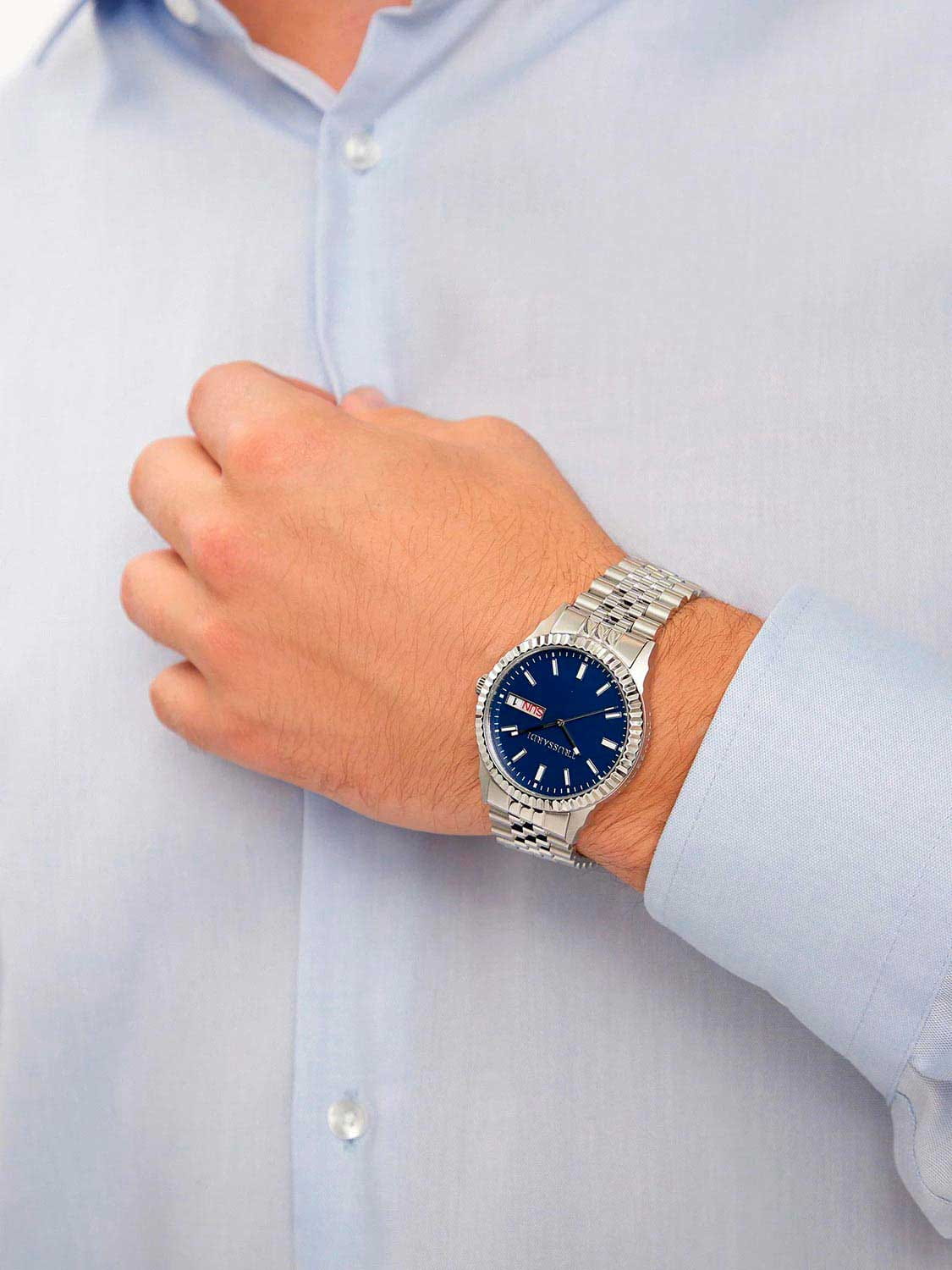 Итальянские мужские часы Trussardi T-Bent R2453141011 - это стильный мужской аксессуар, который сочетает элегантный дизайн и практичность. Корпус выполнен из нержавеющей стали, что обеспечивает долговечность и утончённый внешний вид. Надежное минеральное стеклоМинеральное стеклоМинеральное стекло представляет собой искусственно выращенный минерал кварца. Такое стекло отличается особой устойчивостью к повреждениям и царапинам. Уступает по некоторым качествам сапфировому стеклу. защищает циферблат от царапин и обеспечивает долговечность. Модель оснащена кварцевым механизмом, обеспечивающим высокую точность хода. Браслет из нержавеющей стали с раскладной застёжкойРаскладная застёжкаТакой тип застёжки используется только на браслетах из металла. Она никогда не раскрывается полностью, происходит разделение на 2 и более частей. Раскладывающая застёжка снизит вероятность потери часов к минимуму. обеспечивает комфортное ношение. Водозащита 50 метров позволит защитить корпус от случайных брызг или капель дождя.  Окошки даты и дня недели находятся в положении 3 часа. Стрелки и метки оснащены люминесцентным покрытиемЛюминесцентное покрытиеПозволяет считывать показания времени в темноте. Производители наносят на стрелки, часовые индексы, безель или поверхность циферблата светонакопительный состав, дающий холодное свечение., обеспечивающим отличную видимость даже при слабом освещении. Эта модель – отличный выбор для тех, кто ищет сочетание стиля, качества и функциональности. Часы станут не только полезным аксессуаром, но и выразительным элементом вашего имиджа.