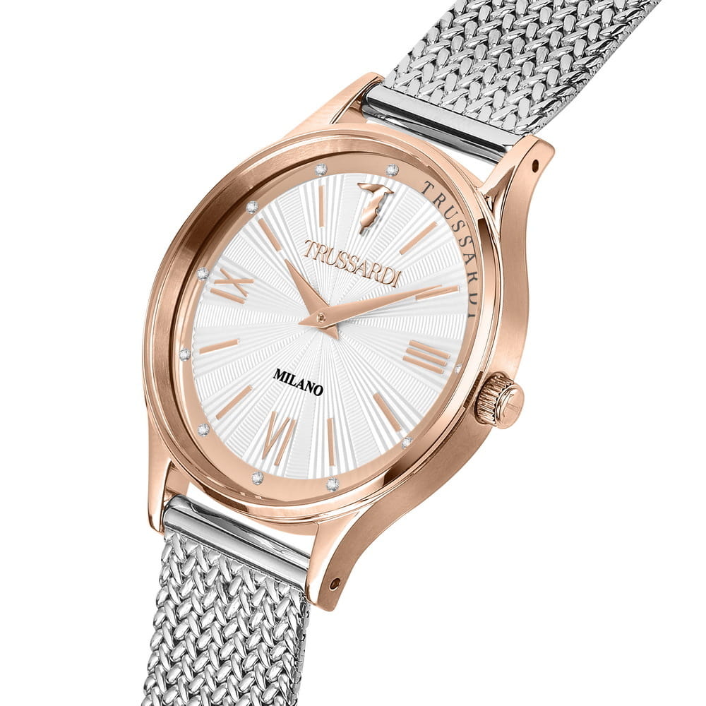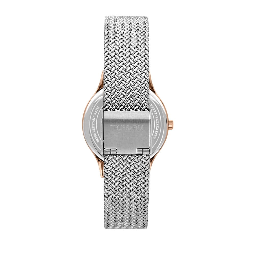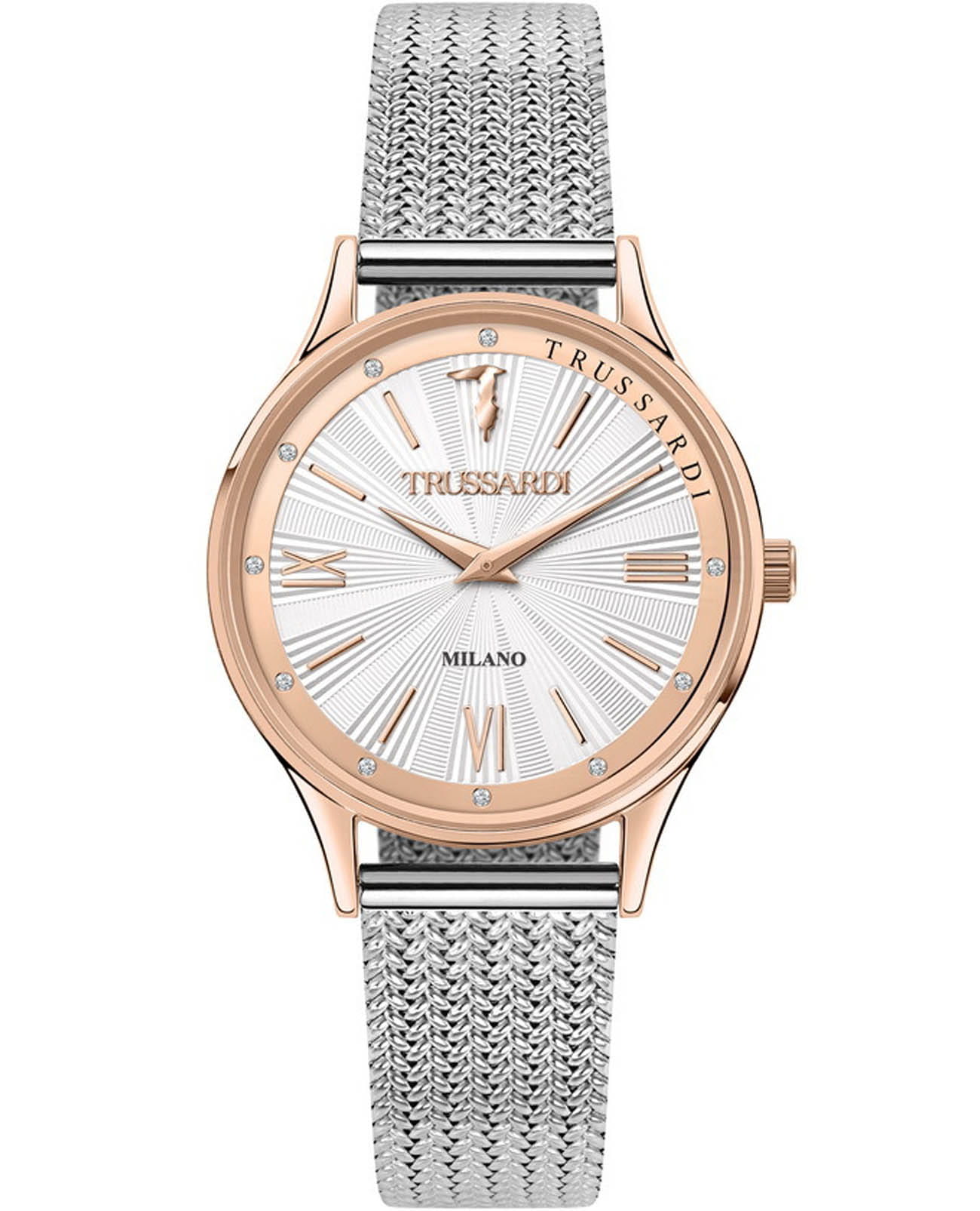 Итальянские женские часы Trussardi T-Star R2453152507 - это стильный женский аксессуар, который сочетает элегантный дизайн и практичность. Корпус выполнен из нержавеющей стали с IP-покрытиемIP-покрытиеМетод ионного напыления. Демонстрирует повышенную устойчивость к истиранию, окислению и химическим веществам. Под воздействием высокого давления и температуры около 1500°C молекулы металла надёжно соединяются с частицами корпуса часов., что обеспечивает долговечность и утончённый внешний вид. Надежное минеральное стеклоМинеральное стеклоМинеральное стекло представляет собой искусственно выращенный минерал кварца. Такое стекло отличается особой устойчивостью к повреждениям и царапинам. Уступает по некоторым качествам сапфировому стеклу. защищает циферблат от царапин и обеспечивает долговечность. Циферблат украшен стеклянными кристаллами. Модель оснащена кварцевым механизмом, обеспечивающим высокую точность хода. Браслет из нержавеющей стали с раскладным замкомРаскладной замокДанный вариант застежки используется только на часах с металлическим браслетом. Отличительная особенность такого крепления в том, что длина браслета становится универсальной и вы можете самостоятельно отрегулировать нужный вам размер – застежка просто двигается по браслету часов. обеспечивает комфортное ношение. Водозащита 50 метров позволит защитить корпус от случайных брызг или капель дождя. Эта модель – отличный выбор для тех, кто ищет сочетание стиля, качества и функциональности. Часы станут не только полезным аксессуаром, но и выразительным элементом вашего имиджа.