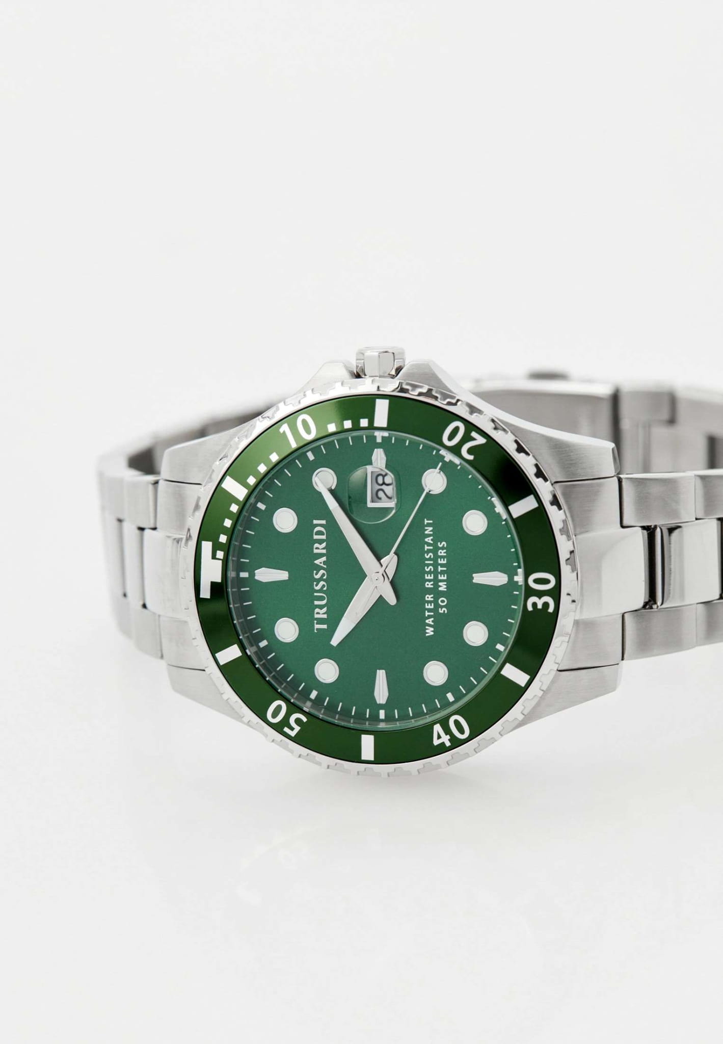 Итальянские мужские часы Trussardi City Life R2453169004 - это стильный мужской аксессуар, который сочетает элегантный дизайн и практичность. Корпус выполнен из нержавеющей стали с безелемБезельВнешний ободок, закрепляющий стекло. В спортивных часах так называется поворотное кольцо с делениями на циферблате, выполняет роль таймера – замеряет отрезки времени на шкале. Неподвижный безель – элемент декора. Однонаправленно вращающийся безель на дайверских часах позволяет фиксировать моменты погружения и выныривания на поверхность. с IP-покрытиемIP-покрытиеМетод ионного напыления. Демонстрирует повышенную устойчивость к истиранию, окислению и химическим веществам. Под воздействием высокого давления и температуры около 1500°C молекулы металла надёжно соединяются с частицами корпуса часов., что обеспечивает долговечность и утончённый внешний вид. Надежное минеральное стеклоМинеральное стеклоМинеральное стекло представляет собой искусственно выращенный минерал кварца. Такое стекло отличается особой устойчивостью к повреждениям и царапинам. Уступает по некоторым качествам сапфировому стеклу. защищает циферблат от царапин и обеспечивает долговечность. Модель оснащена кварцевым механизмом, обеспечивающим высокую точность хода. Браслет из нержавеющей стали с раскладной застёжкойРаскладная застёжкаТакой тип застёжки используется только на браслетах из металла. Она никогда не раскрывается полностью, происходит разделение на 2 и более частей. Раскладывающая застёжка снизит вероятность потери часов к минимуму. обеспечивает комфортное ношение. Водозащита 50 метров позволит защитить корпус от случайных брызг или капель дождя. Окошко даты в положении 3 часов. Стрелки метки оснащены люминесцентным покрытиемЛюминесцентное покрытиеПозволяет считывать показания времени в темноте. Производители наносят на стрелки, часовые индексы, безель или поверхность циферблата светонакопительный состав, дающий холодное свечение., обеспечивающим отличную видимость даже при слабом освещении. Эта модель – отличный выбор для тех, кто ищет сочетание стиля, качества и функциональности. Часы станут не только полезным аксессуаром, но и выразительным элементом вашего имиджа.