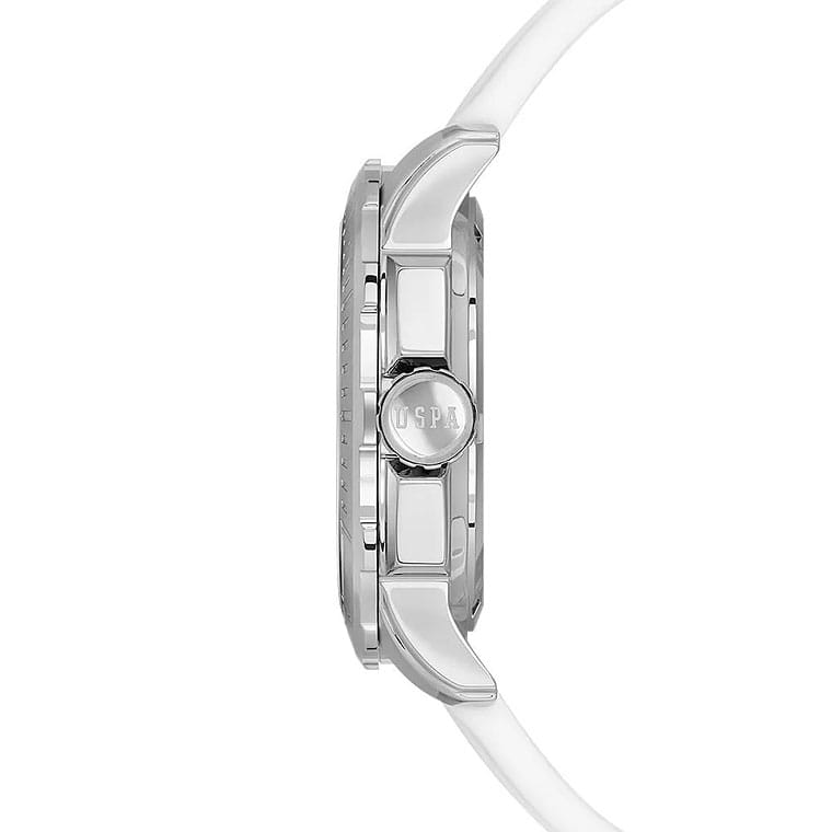Мужские изысканные американские часы U.S. Polo Assn. Crossing USPA1066-01, кварцевый механизм с высокой точностью. Минеральное стеклоМинеральное стеклоМинеральное стекло представляет собой искусственно выращенный минерал кварца. Такое стекло отличается особой устойчивостью к повреждениям и царапинам. Уступает по некоторым качествам сапфировому стеклу. устойчивое к появлению царапин, обладающее высокой прозрачностью. Корпус изготовлен из нержавеющей стали с поворотным безелемБезельВнешний ободок, закрепляющий стекло. В спортивных часах так называется поворотное кольцо с делениями на циферблате, выполняет роль таймера – замеряет отрезки времени на шкале. Неподвижный безель – элемент декора. Однонаправленно вращающийся безель на дайверских часах позволяет фиксировать моменты погружения и выныривания на поверхность.. На стильном синем циферблате три дополнительных индикатора. Центральные часовая, минутная и секундная стрелки. Индикация даты и дня недели. 12/24х часовой формат времени. Класс водозащиты: 50 метров, позволит защитить корпус от случайных брызг или капель дождя. Силиконовый ремешок белого цвета со стандартной застежкой безупречно дополняет корпус. Стрелки оснащены люминесцентным покрытиемЛюминесцентное покрытиеПозволяет считывать показания времени в темноте. Производители наносят на стрелки, часовые индексы, безель или поверхность циферблата светонакопительный состав, дающий холодное свечение., обеспечивающим хорошую читаемость в темноте. Модель подчёркивает индивидуальность владельца и идеально подходит как для повседневного, так и для делового образа.