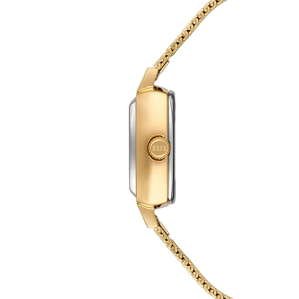 Женские наручные часы U.S. Polo Assn. Stile USPA2066-04 — это стильный и лаконичный аксессуар, выполненный в форме квадрата. Модель изготовлена из стали с PVD-покрытиемPVDУльтратонкое покрытие наносится в технике вакуумного напыления, сочетает в себе нитрид титана особой прочности со слоем золота или оксида хрома. Несёт в себе декоративную или защитную функцию. цвета желтого золота, придающий благородный внешний вид и устойчивость к царапинам. Циферблат зеленого цвета дополнен секундной стрелкой, обеспечивающей точность отсчёта времени. Защиту циферблата обеспечивает минеральное стеклоМинеральное стеклоМинеральное стекло представляет собой искусственно выращенный минерал кварца. Такое стекло отличается особой устойчивостью к повреждениям и царапинам. Уступает по некоторым качествам сапфировому стеклу., устойчивое к мелким повреждениям. Часы оснащены кварцевым механизмом, гарантирующим точность и минимальное обслуживание. Водонепроницаемость 3 АТМ позволяет использовать часы в повседневных условиях — при мытье рук или под лёгким дождём. Браслет выполнен в технике миланской сетки из стали с PVD-покрытиемPVDУльтратонкое покрытие наносится в технике вакуумного напыления, сочетает в себе нитрид титана особой прочности со слоем золота или оксида хрома. Несёт в себе декоративную или защитную функцию. и оснащён раскладным замкомРаскладной замокДанный вариант застежки используется только на часах с металлическим браслетом. Отличительная особенность такого крепления в том, что длина браслета становится универсальной и вы можете самостоятельно отрегулировать нужный вам размер – застежка просто двигается по браслету часов., обеспечивающей комфорт и уверенную фиксацию на запястье. Толщина корпуса составляет 10 мм, а его размер 26 мм, что делает часы компактными и удобными в носке. Эти часы станут универсальным аксессуаром для уверенных в себе женщин, которые ценят сочетание стиля, качества и эстетики — идеальный выбор для повседневного образа и торжественных случаев.
