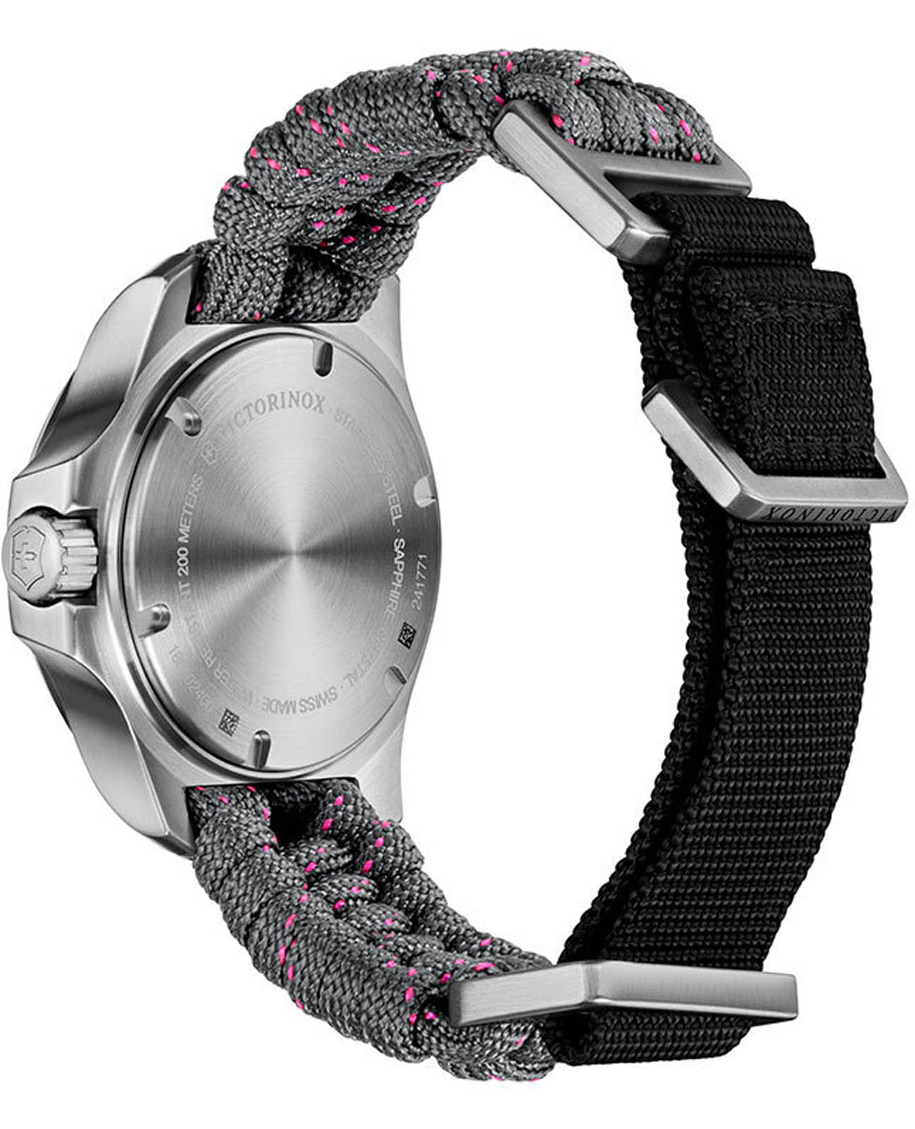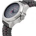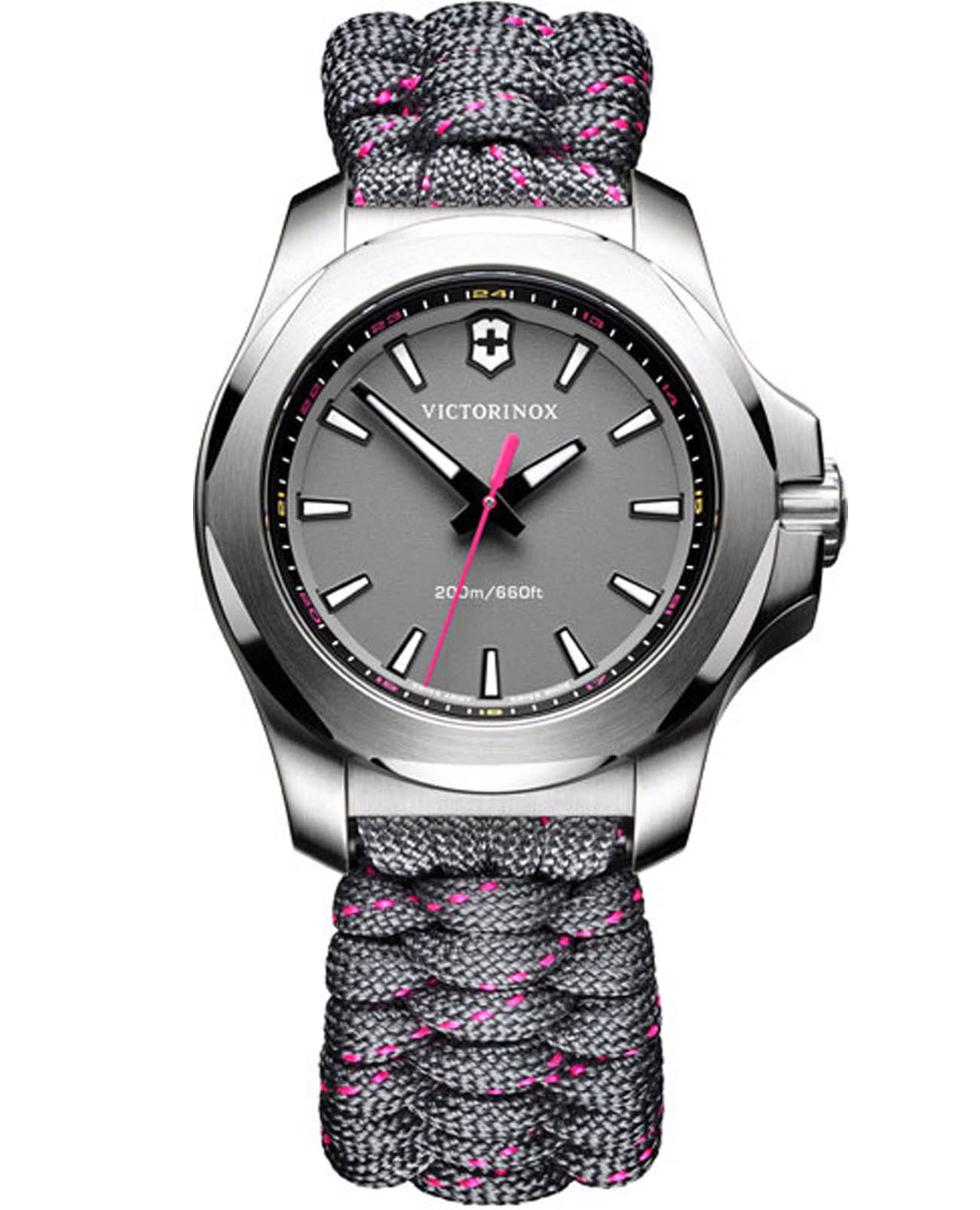 Женские швейцарские часы Victorinox I.N.O.X. V 241771. Сапфировое стеклоСапфировое стеклоПрочный и надёжный материал из кристалла сапфира синтетического происхождения, характеризующийся особой твёрдостью и устойчивостью к царапинам и повреждениям. с трёхслойным антибликовым покрытием. Корпус часов выполнен из нержавеющей стали 316L. Ремешок изготовлен из плетенной паракордовой стропы, длиной 2,5 метра и способной выдержать 250 кг. Влагозащита: 200 метров, позволит плавать, нырять и заниматься другими водными видами спорта. Стрелки и метки с люминесцентным покрытиемЛюминесцентное покрытиеПозволяет считывать показания времени в темноте. Производители наносят на стрелки, часовые индексы, безель или поверхность циферблата светонакопительный состав, дающий холодное свечение.. 12 и 24-часовой формат времени.