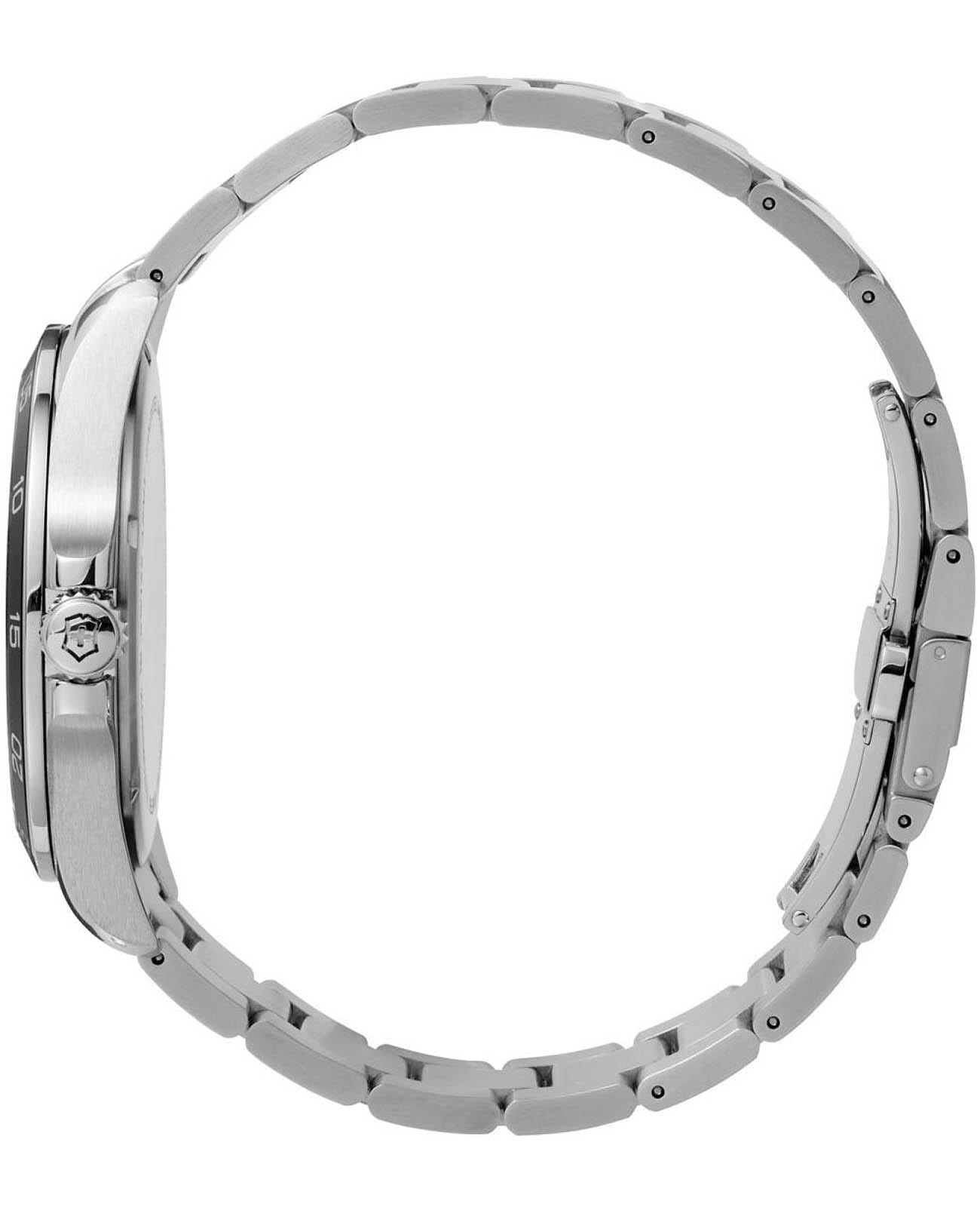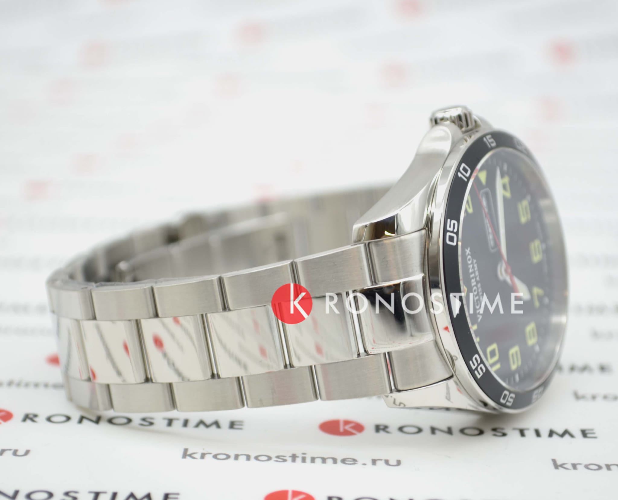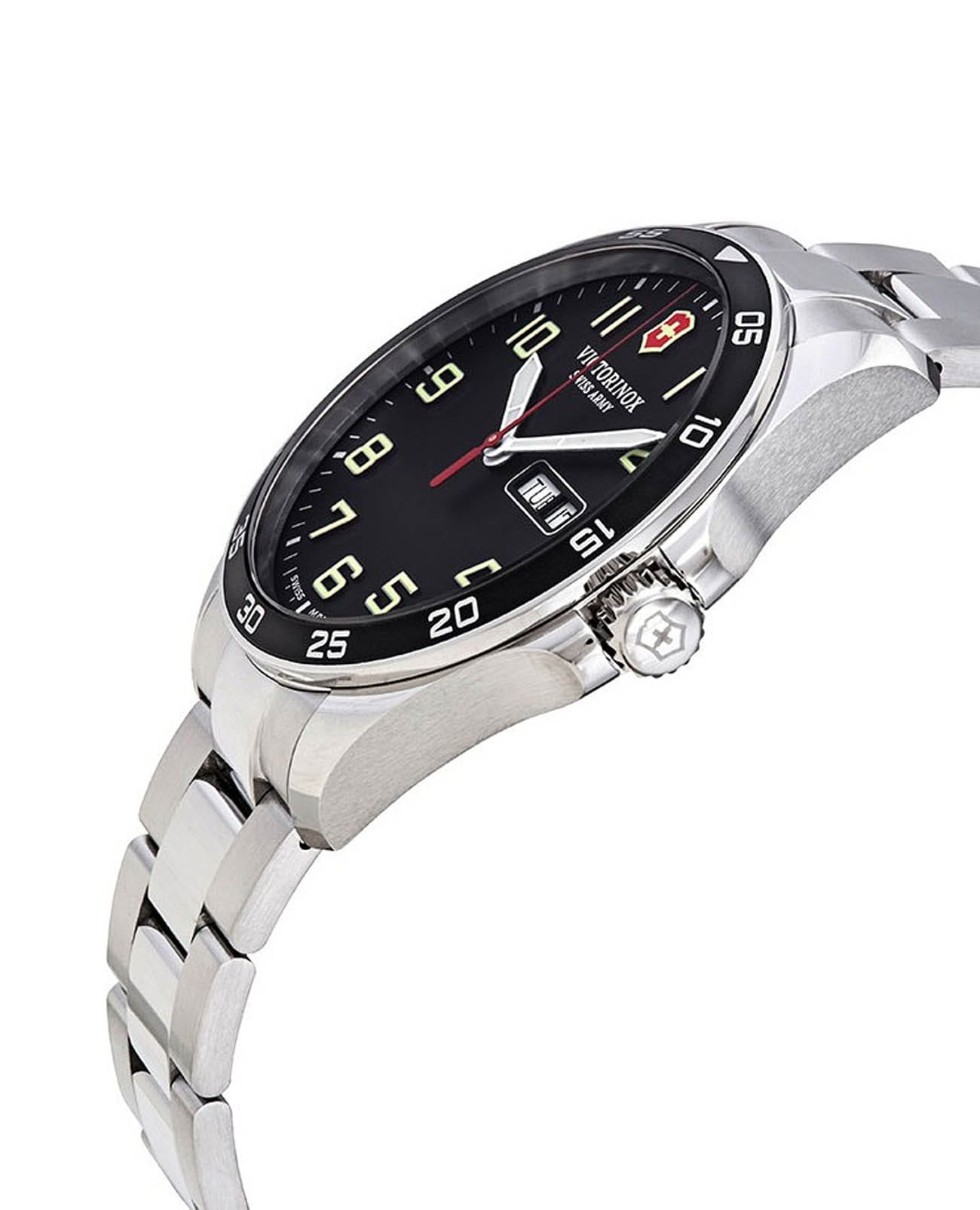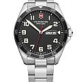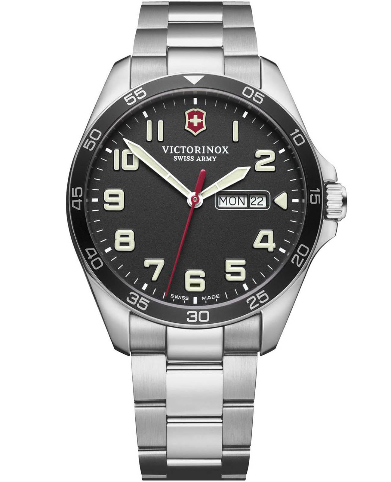 Мужские швейцарские часы Victorinox Fieldforce 241849 с надёжным кварцевым механизмом. Сапфировое стеклоСапфировое стеклоПрочный и надёжный материал из кристалла сапфира синтетического происхождения, характеризующийся особой твёрдостью и устойчивостью к царапинам и повреждениям. с трёхслойным антибликовым покрытием. Корпус часов выполнен из нержавеющей стали 316L. Стальной браслет на раскладной застёжкеРаскладная застёжкаТакой тип застёжки используется только на браслетах из металла. Она никогда не раскрывается полностью, происходит разделение на 2 и более частей. Раскладывающая застёжка снизит вероятность потери часов к минимуму.. Влагозащита: 100 метров, позволит плавать, нырять и заниматься другими водными видами спорта. Окошко даты и дня недели находится в положении 3 часа. Стрелки и метки с люминесцентным покрытиемЛюминесцентное покрытиеПозволяет считывать показания времени в темноте. Производители наносят на стрелки, часовые индексы, безель или поверхность циферблата светонакопительный состав, дающий холодное свечение..