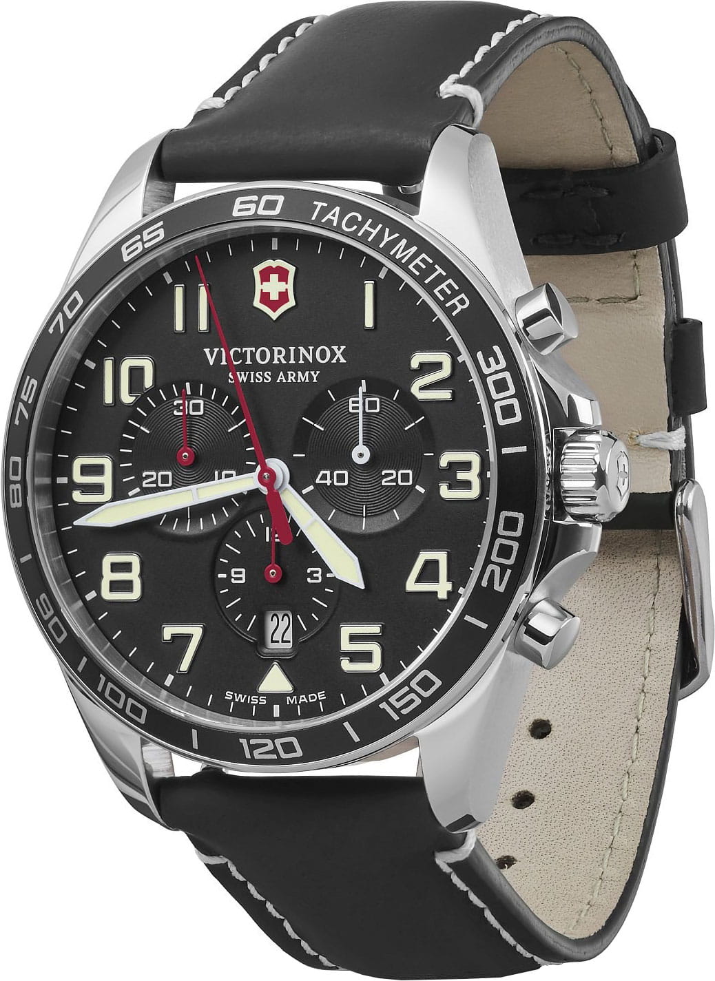 Мужские швейцарские часы-хронографХронографФункция позволяет измерять отрезки времени с особой точностью: часы, минуты, секунды. Верным признаком хронографа является наличие на циферблате 3 дополнительных окошек-счётчиков. Victorinox Fieldforce Chronograph 241852 с надёжным кварцевым механизмом. Сапфировое стеклоСапфировое стеклоПрочный и надёжный материал из кристалла сапфира синтетического происхождения, характеризующийся особой твёрдостью и устойчивостью к царапинам и повреждениям. с трёхслойным антибликовым покрытием. Корпус часов выполнен из стали с PVD-покрытиемPVDУльтратонкое покрытие наносится в технике вакуумного напыления, сочетает в себе нитрид титана особой прочности со слоем золота или оксида хрома. Несёт в себе декоративную или защитную функцию.. Практичный кожаный ремешок на стандартной застёжке. Влагозащита: 100 метров, позволит плавать, нырять и заниматься другими водными видами спорта. Окошко даты находится в положении 6 часов, стрелки и метки с люминесцентным покрытиемЛюминесцентное покрытиеПозволяет считывать показания времени в темноте. Производители наносят на стрелки, часовые индексы, безель или поверхность циферблата светонакопительный состав, дающий холодное свечение., тахиметрТахиметрРазмеченная шкала, располагается на ободке или безеле часов. Тахиметр позволяет рассчитать скорость на определённом участке пути, расстояние измеряется в километрах или милях..
