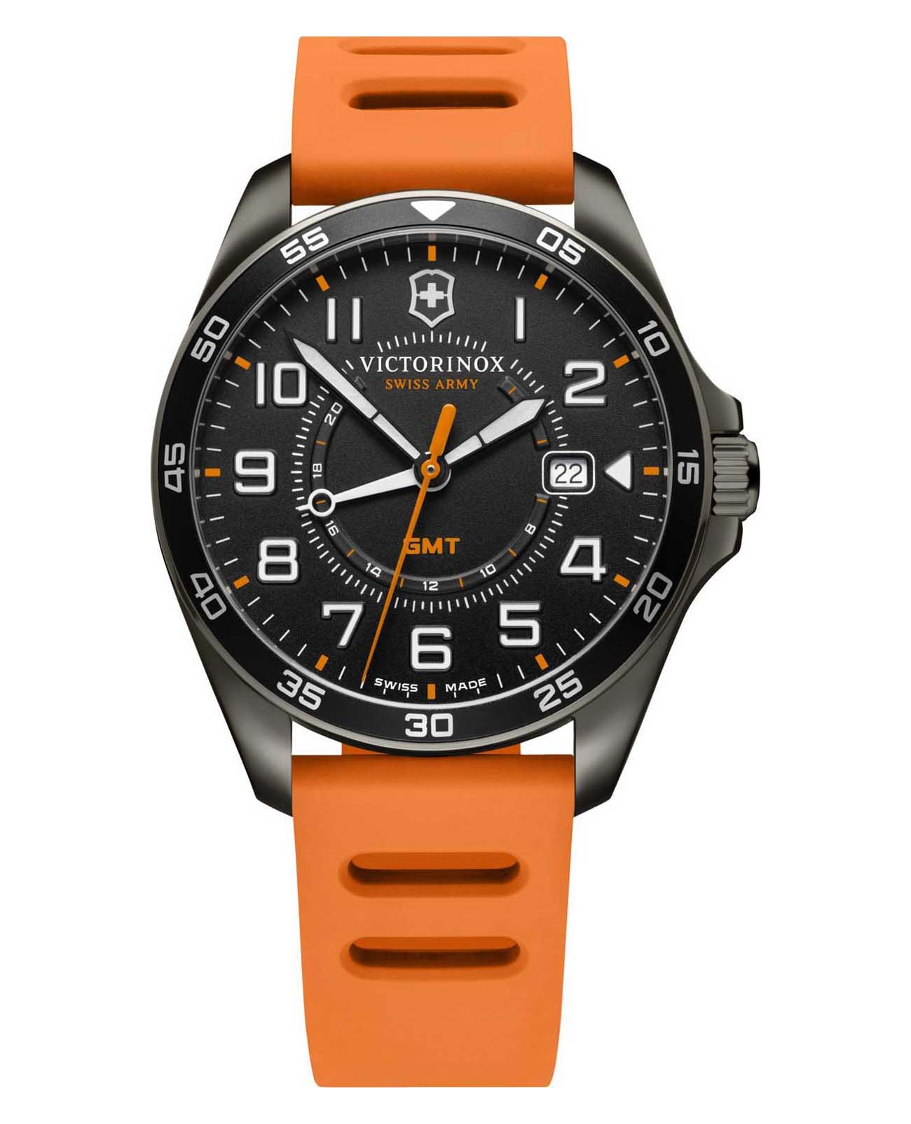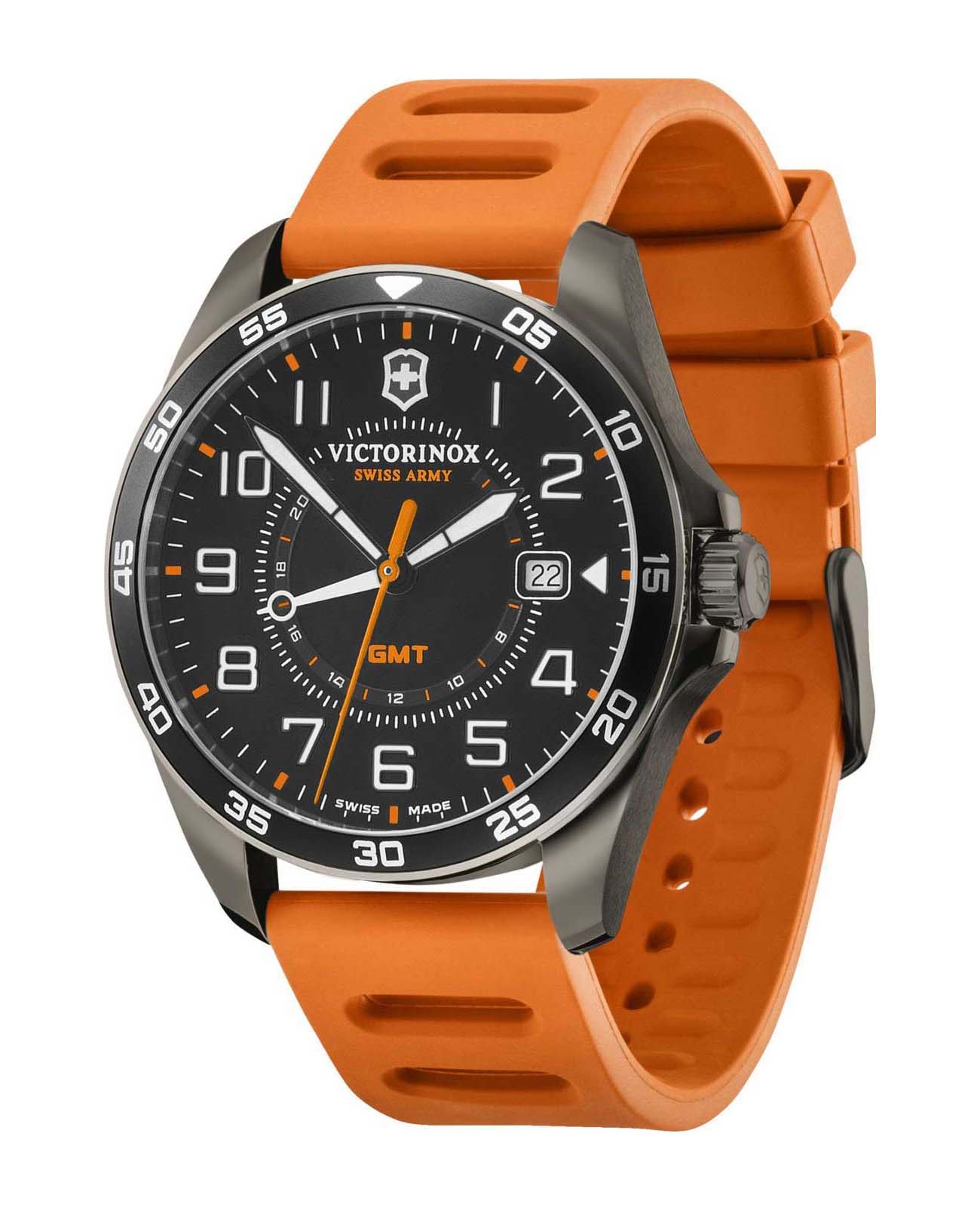 Мужские швейцарские часы-хронографХронографФункция позволяет измерять отрезки времени с особой точностью: часы, минуты, секунды. Верным признаком хронографа является наличие на циферблате 3 дополнительных окошек-счётчиков. Victorinox Fieldforce Sport Chronograph 241897 с надёжным кварцевым механизмом. Сапфировое стеклоСапфировое стеклоПрочный и надёжный материал из кристалла сапфира синтетического происхождения, характеризующийся особой твёрдостью и устойчивостью к царапинам и повреждениям. с трёхслойным антибликовым покрытием. Корпус часов выполнен из нержавеющей стали с PVD-покрытиемPVDУльтратонкое покрытие наносится в технике вакуумного напыления, сочетает в себе нитрид титана особой прочности со слоем золота или оксида хрома. Несёт в себе декоративную или защитную функцию.. Второй часовой пояс в 24-х часовом формате времени отображается дополнительной центральной стрелкой. Окошко даты находится в положении 3 часов, стрелки и метки с люминесцентным покрытиемЛюминесцентное покрытиеПозволяет считывать показания времени в темноте. Производители наносят на стрелки, часовые индексы, безель или поверхность циферблата светонакопительный состав, дающий холодное свечение.. Класс водозащиты: 100 метров, позволит плавать, нырять и заниматься другими водными видами спорта. Практичный резиновый ремешок на стандартной застёжке.