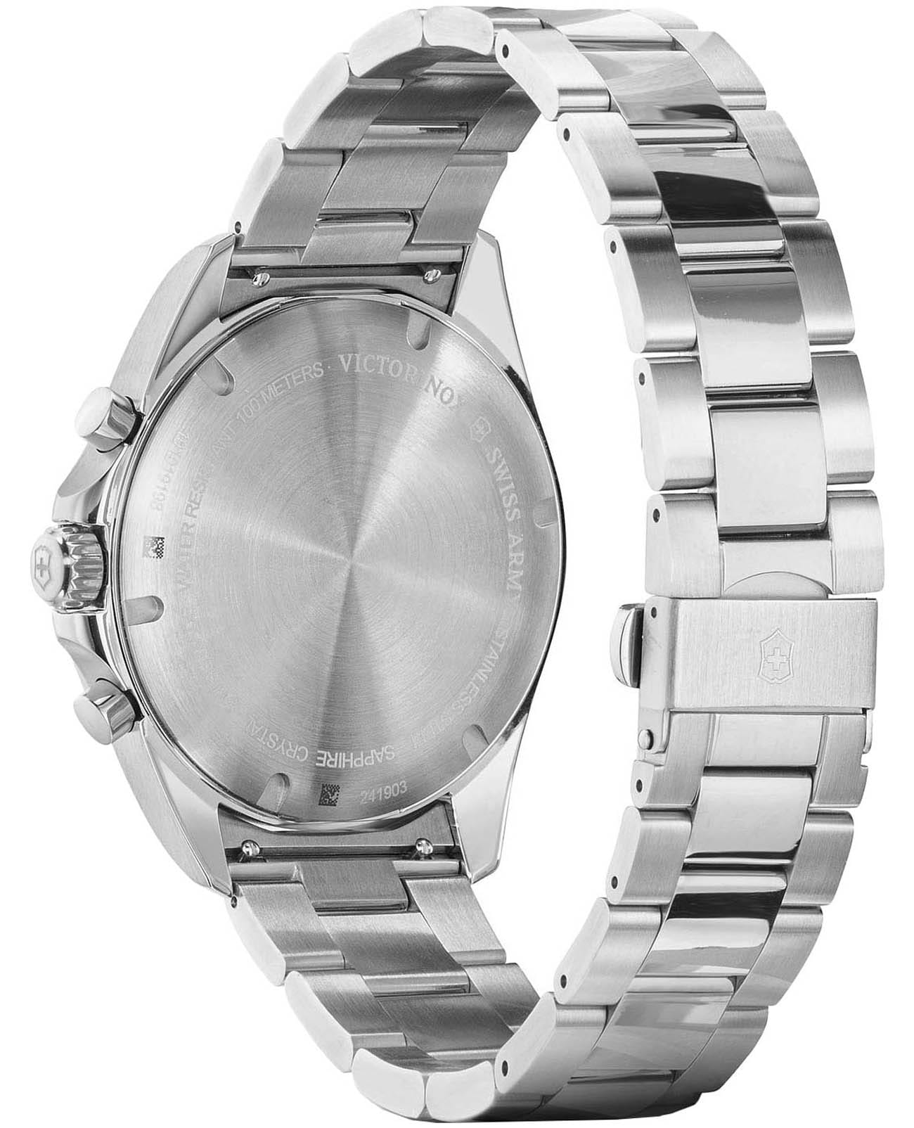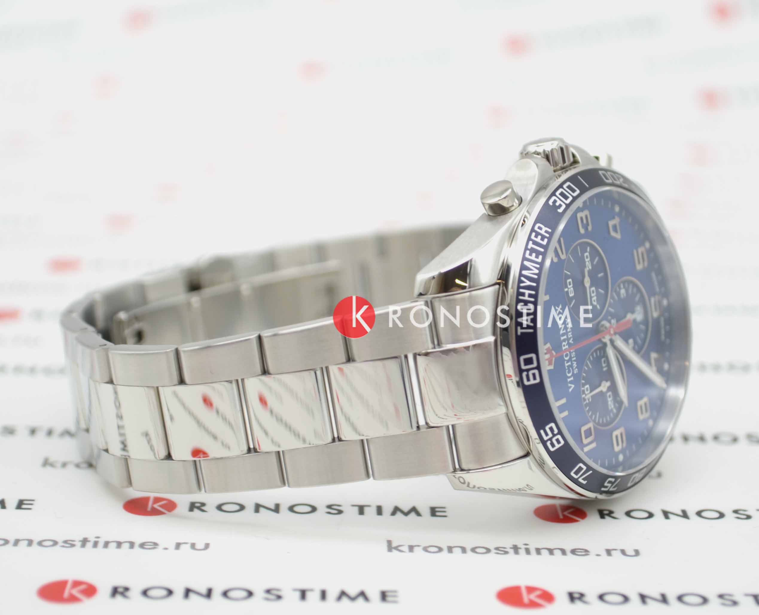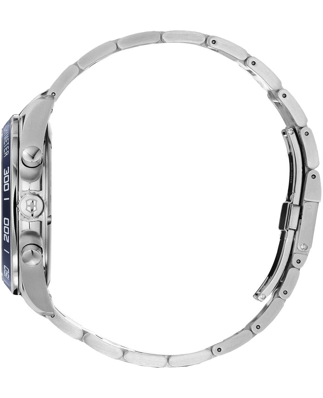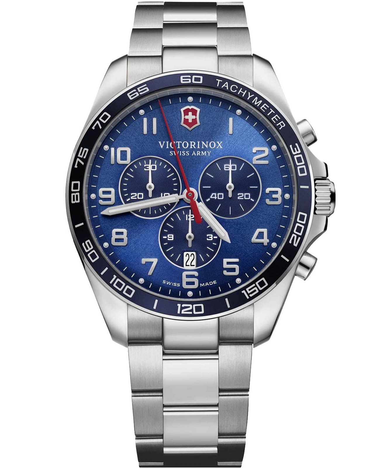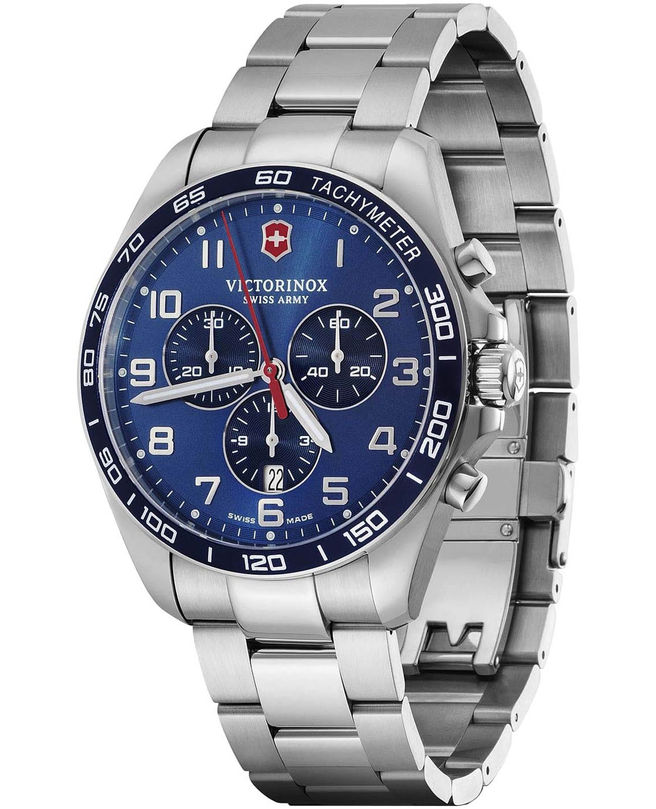 Мужские швейцарские часы-хронографХронографФункция позволяет измерять отрезки времени с особой точностью: часы, минуты, секунды. Верным признаком хронографа является наличие на циферблате 3 дополнительных окошек-счётчиков. Victorinox Fieldforce Chronograph 241901 с надёжным кварцевым механизмом. Сапфировое стеклоСапфировое стеклоПрочный и надёжный материал из кристалла сапфира синтетического происхождения, характеризующийся особой твёрдостью и устойчивостью к царапинам и повреждениям. с трёхслойным антибликовым покрытием. Корпус часов выполнен из нержавеющей стали 316L. Стальной браслет на раскладной застёжкеРаскладная застёжкаТакой тип застёжки используется только на браслетах из металла. Она никогда не раскрывается полностью, происходит разделение на 2 и более частей. Раскладывающая застёжка снизит вероятность потери часов к минимуму.. Влагозащита: 100 метров, позволит плавать, нырять и заниматься другими водными видами спорта. Окошко даты находится в положении 6 часов, стрелки и метки с люминесцентным покрытиемЛюминесцентное покрытиеПозволяет считывать показания времени в темноте. Производители наносят на стрелки, часовые индексы, безель или поверхность циферблата светонакопительный состав, дающий холодное свечение., тахиметрТахиметрРазмеченная шкала, располагается на ободке или безеле часов. Тахиметр позволяет рассчитать скорость на определённом участке пути, расстояние измеряется в километрах или милях..