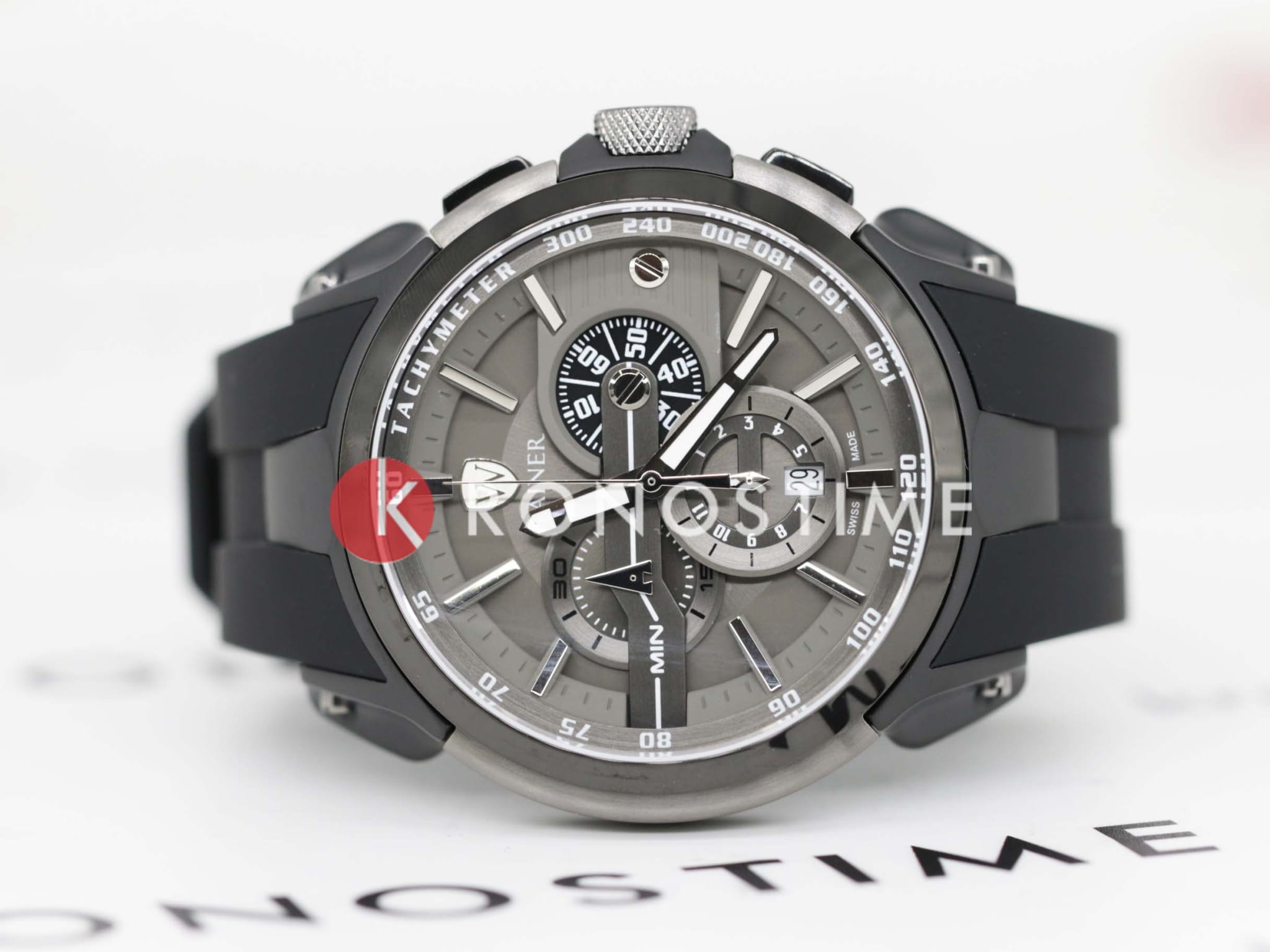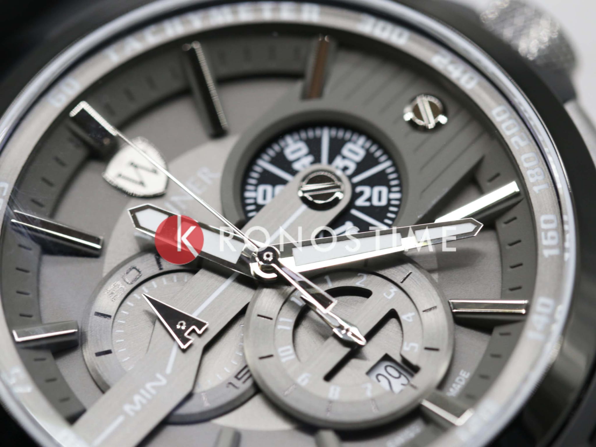 Функциональность дополняется хронографомХронографФункция позволяет измерять отрезки времени с особой точностью: часы, минуты, секунды. Верным признаком хронографа является наличие на циферблате 3 дополнительных окошек-счётчиков. для точного измерения времени, тахиметрической шкалойТахиметрРазмеченная шкала, располагается на ободке или безеле часов. Тахиметр позволяет рассчитать скорость на определённом участке пути, расстояние измеряется в километрах или милях. и индикатором даты.