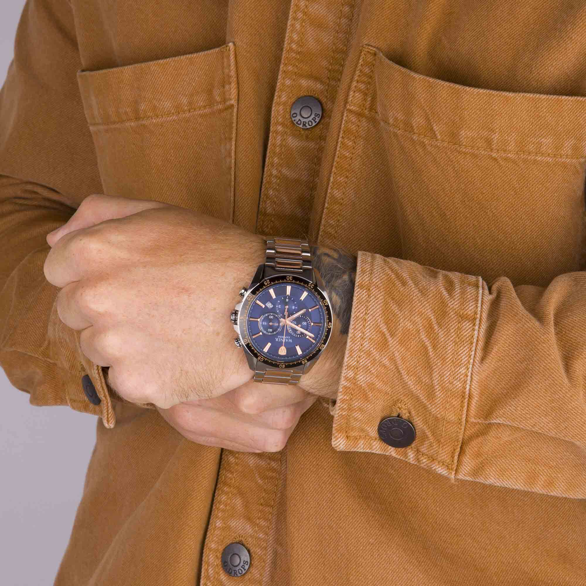 Мужские кварцевые часы Wainer — это стильный аксессуар, сочетающий в себе швейцарское качество и функциональность. Модель выполнена из нержавеющей стали 316L с диаметром корпуса 45 мм и толщиной 12 мм, что делает её прочной и устойчивой к царапинам. Циферблат синего цвета дополнен люминесцентными стрелками, обеспечивающими отличную читаемость даже в условиях слабого освещения. Защиту механизма обеспечивает сапфировое стеклоСапфировое стеклоПрочный и надёжный материал из кристалла сапфира синтетического происхождения, характеризующийся особой твёрдостью и устойчивостью к царапинам и повреждениям., устойчивое к повреждениям. Браслет из стали 316L шириной 22-19 мм оснащён Раскладная застёжкаРаскладная застёжкаТакой тип застёжки используется только на браслетах из металла. Она никогда не раскрывается полностью, происходит разделение на 2 и более частей. Раскладывающая застёжка снизит вероятность потери часов к минимуму., обеспечивающей комфорт и надёжную фиксацию на запястье. Часы водонепроницаемы до 100 метров (, что позволяет использовать их при плавании и других водных активностях без глубокого погружения. Функции включают отображение даты, хронограф и секундомер, что делает модель удобной для повседневного использования. Эти часы станут универсальным аксессуаром для тех, кто ценит сочетание стиля, функциональности и швейцарского мастерства — идеальный выбор для повседневной носки и активного образа жизни.