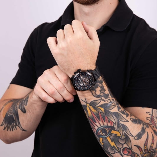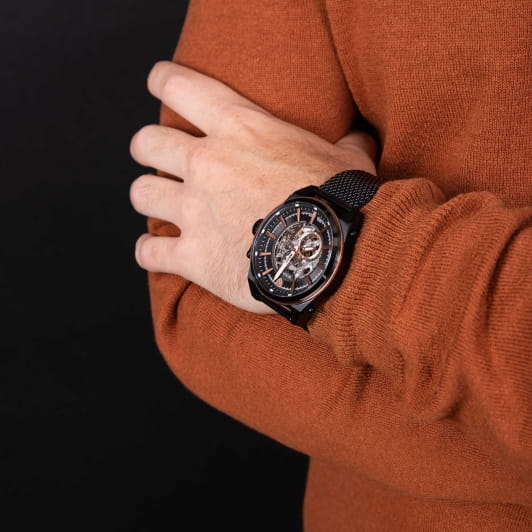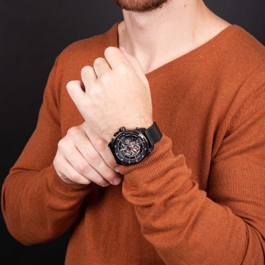Модель Wainer WA.25988-B сочетает элегантный дизайн и высокое качество исполнения. Корпус диаметром 46 мм выполнен из нержавеющей стали 316L с PVD-покрытиемPVDУльтратонкое покрытие наносится в технике вакуумного напыления, сочетает в себе нитрид титана особой прочности со слоем золота или оксида хрома. Несёт в себе декоративную или защитную функцию., обеспечивающей прочность и долговечность. Глубокий черный циферблат дополнен аккуратными часовыми метками и стрелками с люминесцентным покрытиемЛюминесцентное покрытиеПозволяет считывать показания времени в темноте. Производители наносят на стрелки, часовые индексы, безель или поверхность циферблата светонакопительный состав, дающий холодное свечение., улучшая читаемость в условиях недостаточного освещения. Сапфировое стеклоСапфировое стеклоПрочный и надёжный материал из кристалла сапфира синтетического происхождения, характеризующийся особой твёрдостью и устойчивостью к царапинам и повреждениям. защищает дисплей от царапин и механических повреждений. БезельБезельВнешний ободок, закрепляющий стекло. В спортивных часах так называется поворотное кольцо с делениями на циферблате, выполняет роль таймера – замеряет отрезки времени на шкале. Неподвижный безель – элемент декора. Однонаправленно вращающийся безель на дайверских часах позволяет фиксировать моменты погружения и выныривания на поверхность. с PVD-покрытиемPVDУльтратонкое покрытие наносится в технике вакуумного напыления, сочетает в себе нитрид титана особой прочности со слоем золота или оксида хрома. Несёт в себе декоративную или защитную функцию.. Часы оснащены автоматическим механизмом, обеспечивающим надежность и точность хода. Стальной браслет миланского плетения с PVD-покрытиемPVDУльтратонкое покрытие наносится в технике вакуумного напыления, сочетает в себе нитрид титана особой прочности со слоем золота или оксида хрома. Несёт в себе декоративную или защитную функцию. на раскладном замкеРаскладной замокДанный вариант застежки используется только на часах с металлическим браслетом. Отличительная особенность такого крепления в том, что длина браслета становится универсальной и вы можете самостоятельно отрегулировать нужный вам размер – застежка просто двигается по браслету часов.. Водонепроницаемость до 100 метров делает модель подходящей для плавания и активного образа жизни. Wainer WA.25988-B — это стильный и надежный аксессуар для тех, кто ценит швейцарское качество и современные технологии.